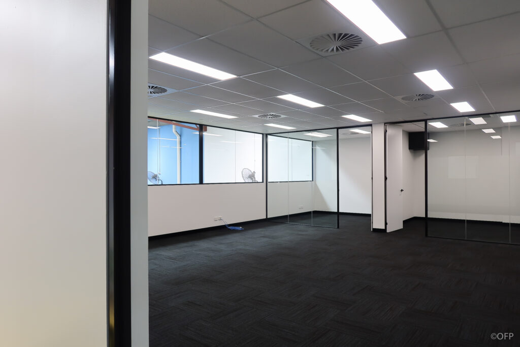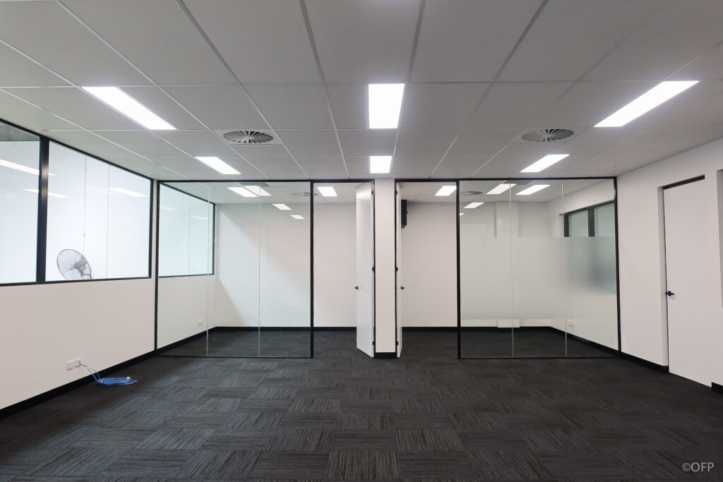 - The wrap around half height plasterboard with glazing above allowed natural light in to the newly formed office space.