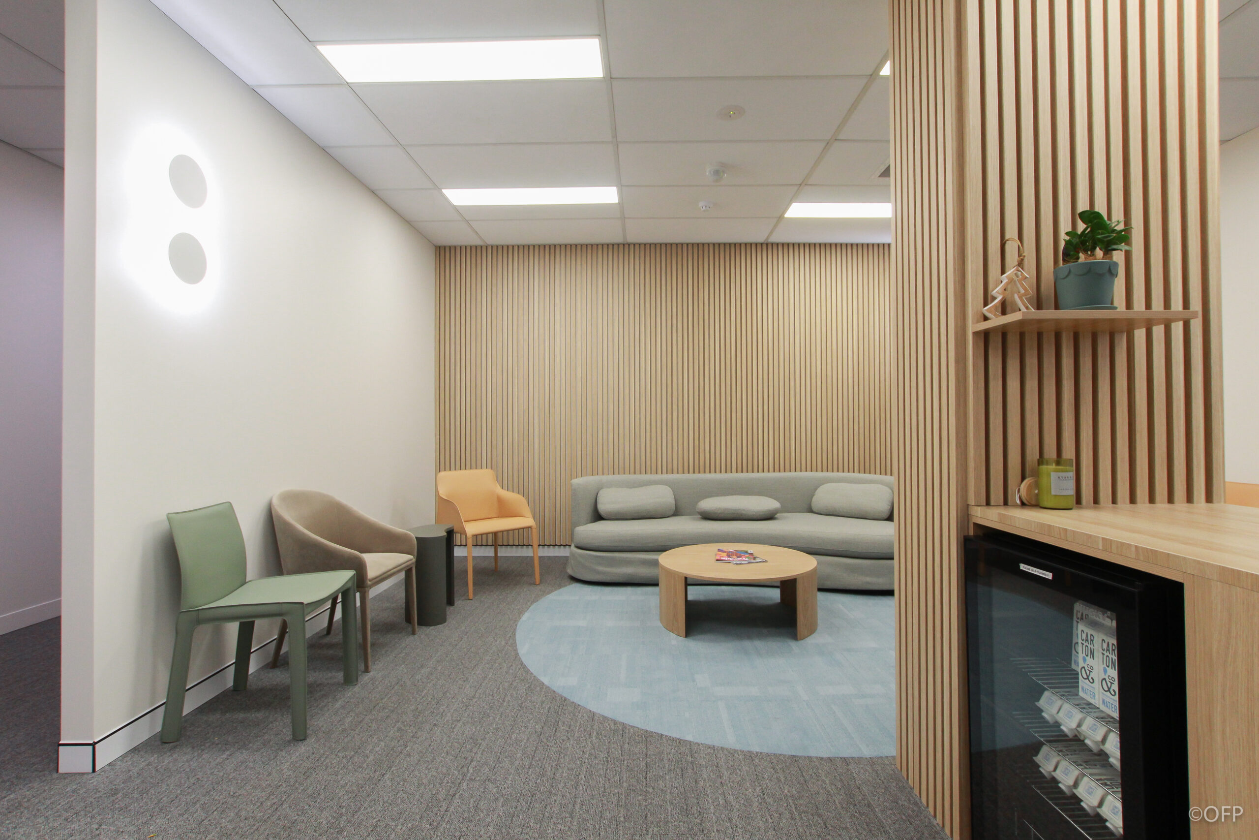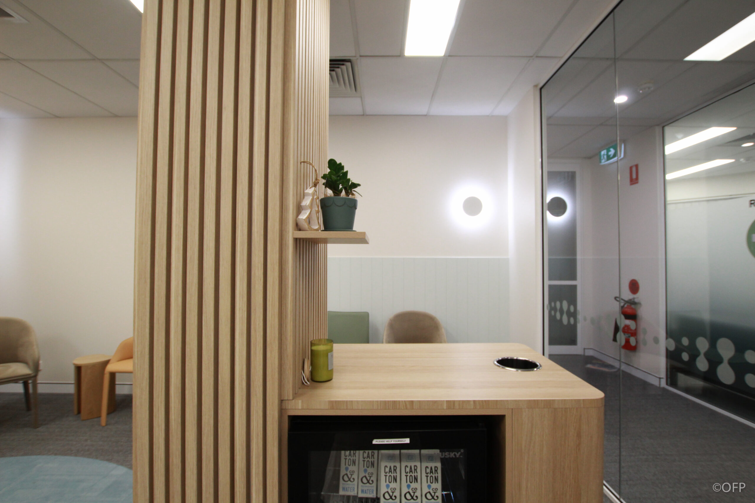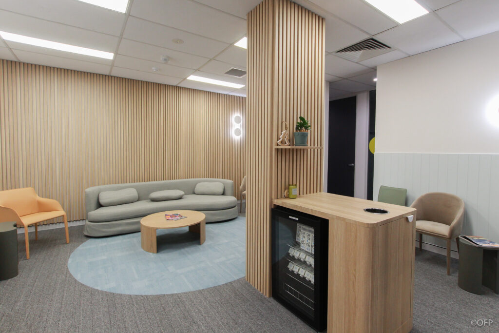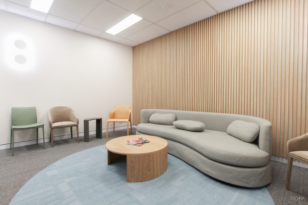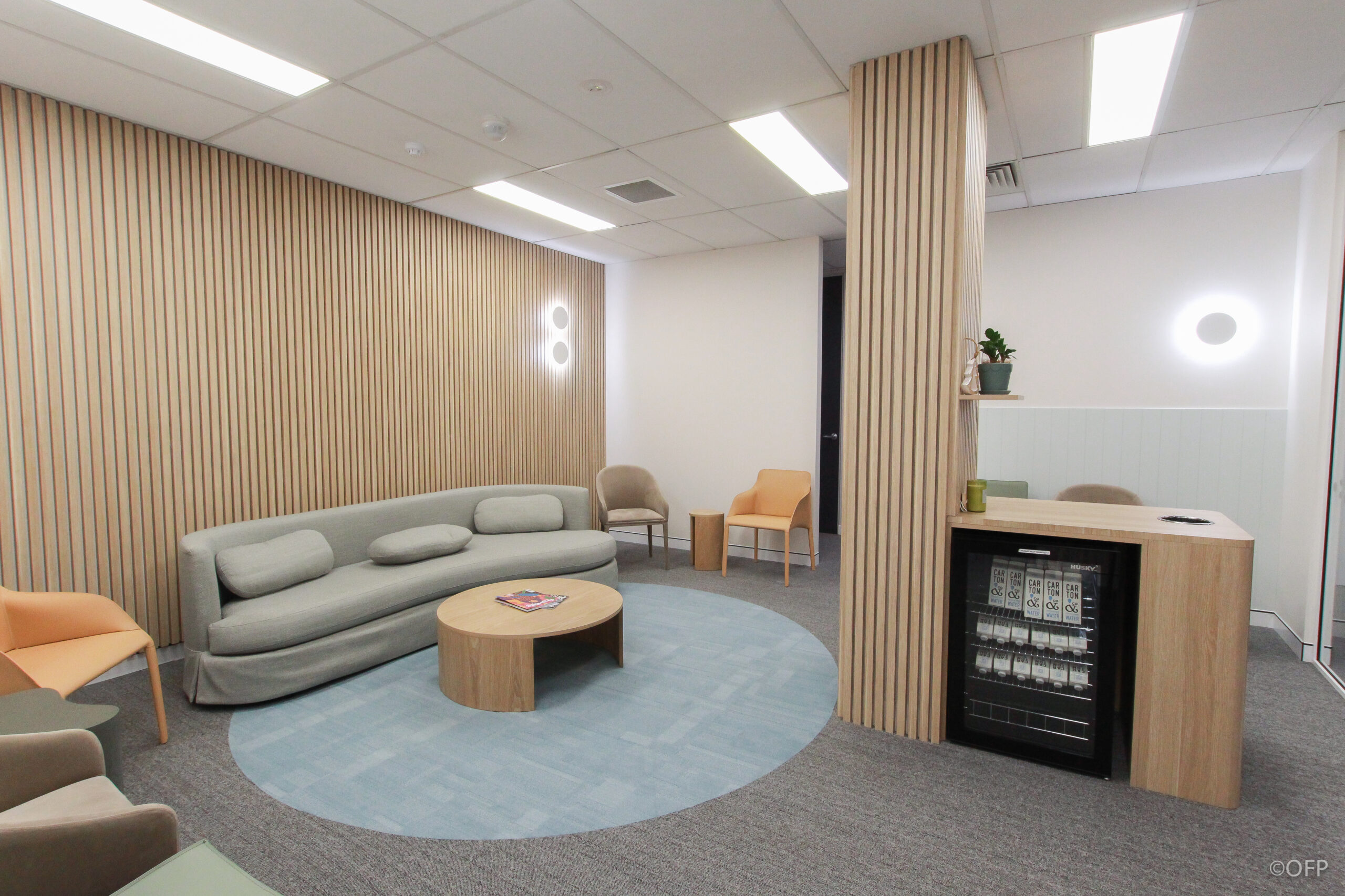 We custom-cut different carpets tiles into the existing flooring, created bespoke joinery and wall panelling and installed special feature lighting to create an exciting tenancy consistently involving company colours throughout. The result is an uplifting workplace and a welcoming environment for patients delivered with the full trust and collaboration with LDE.
