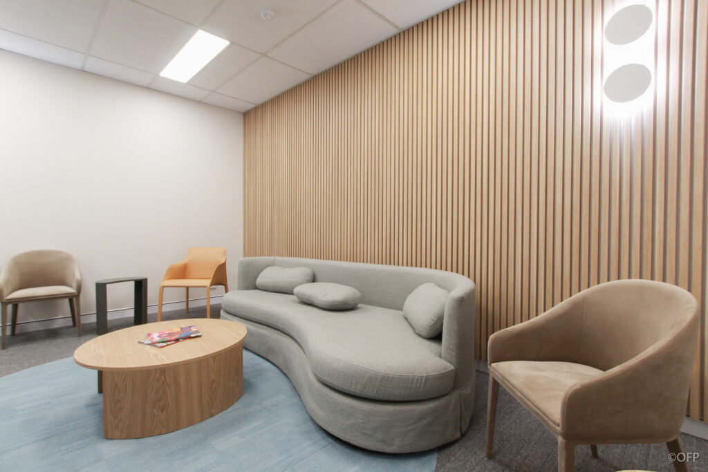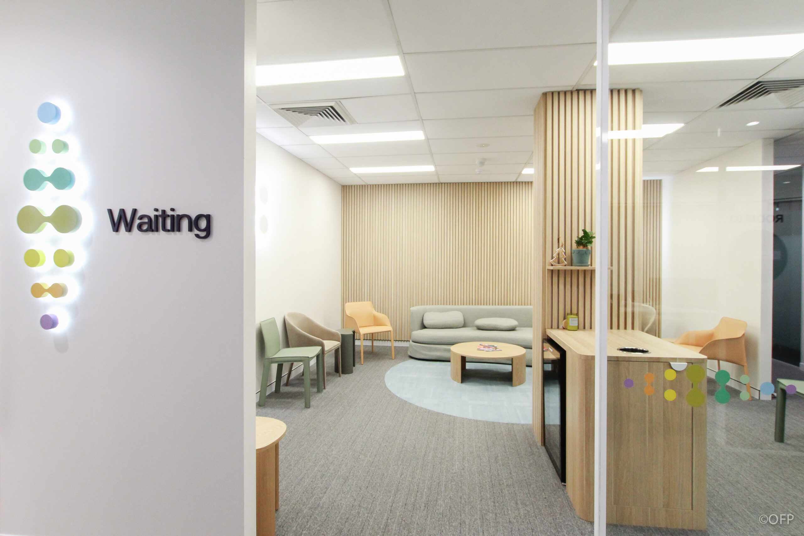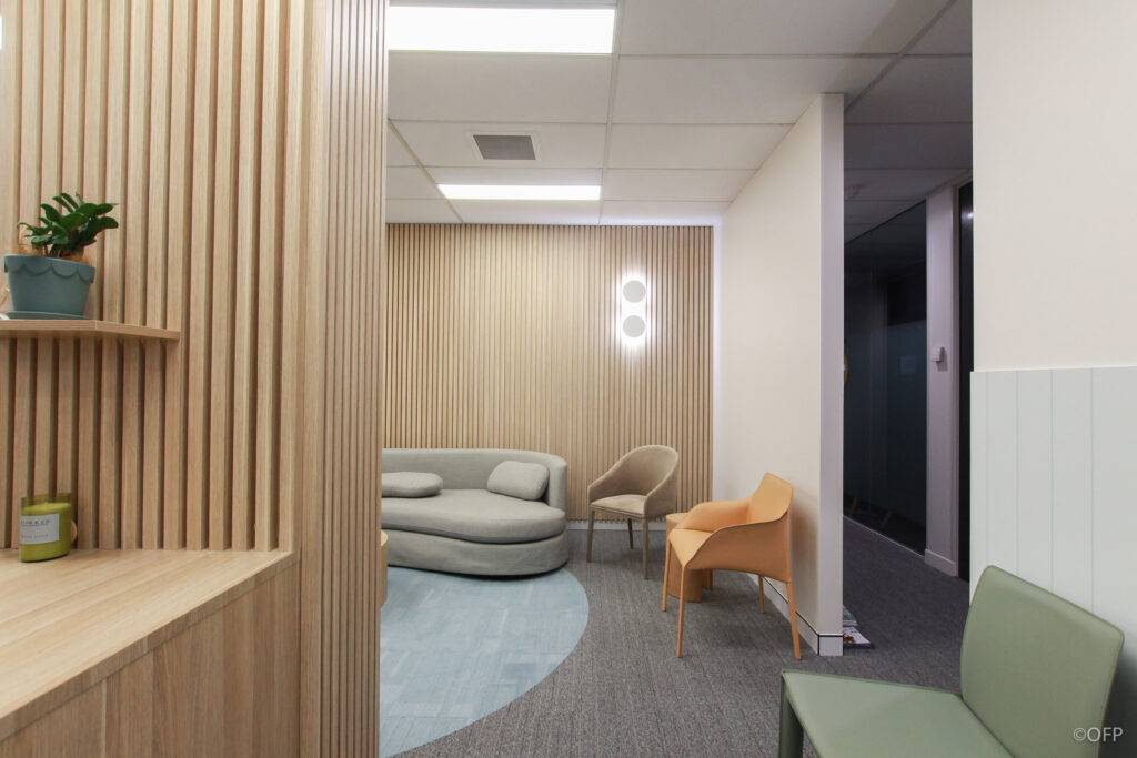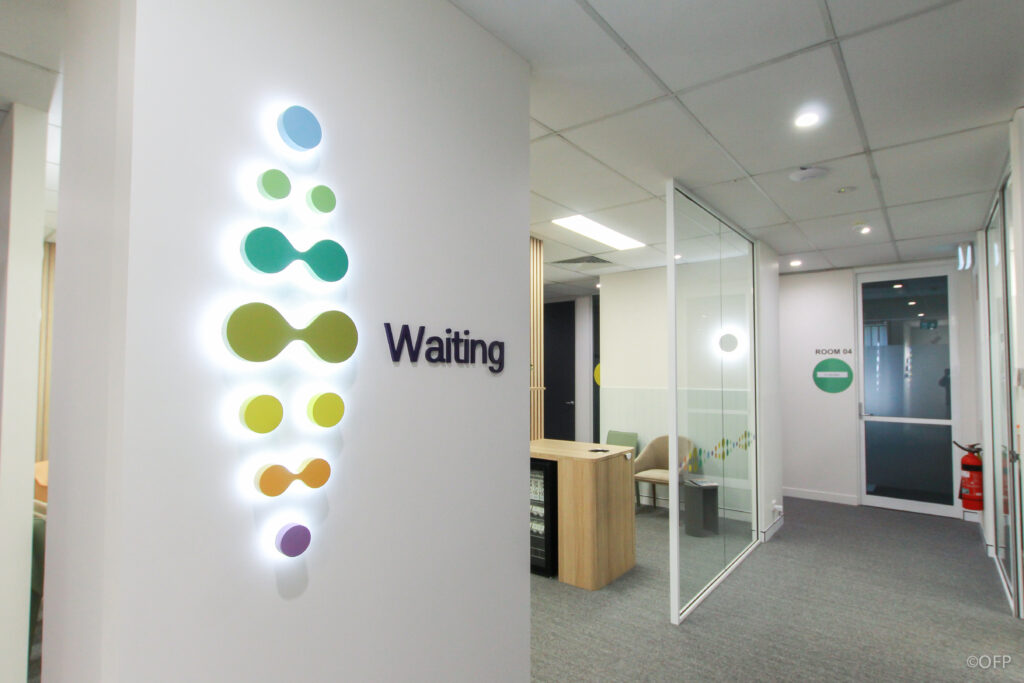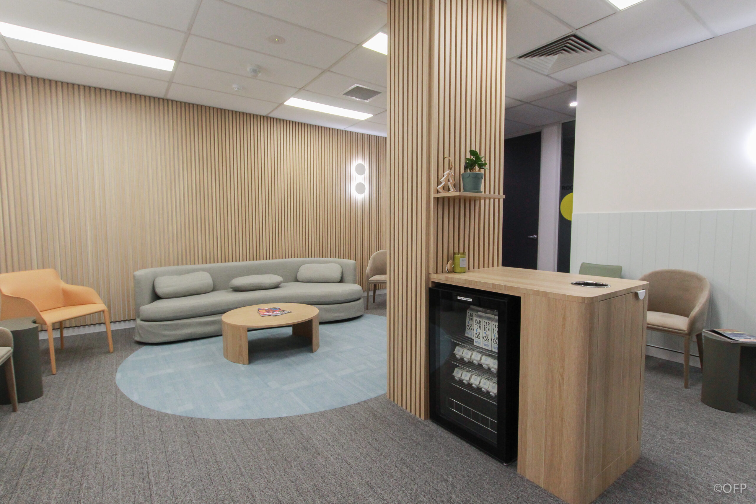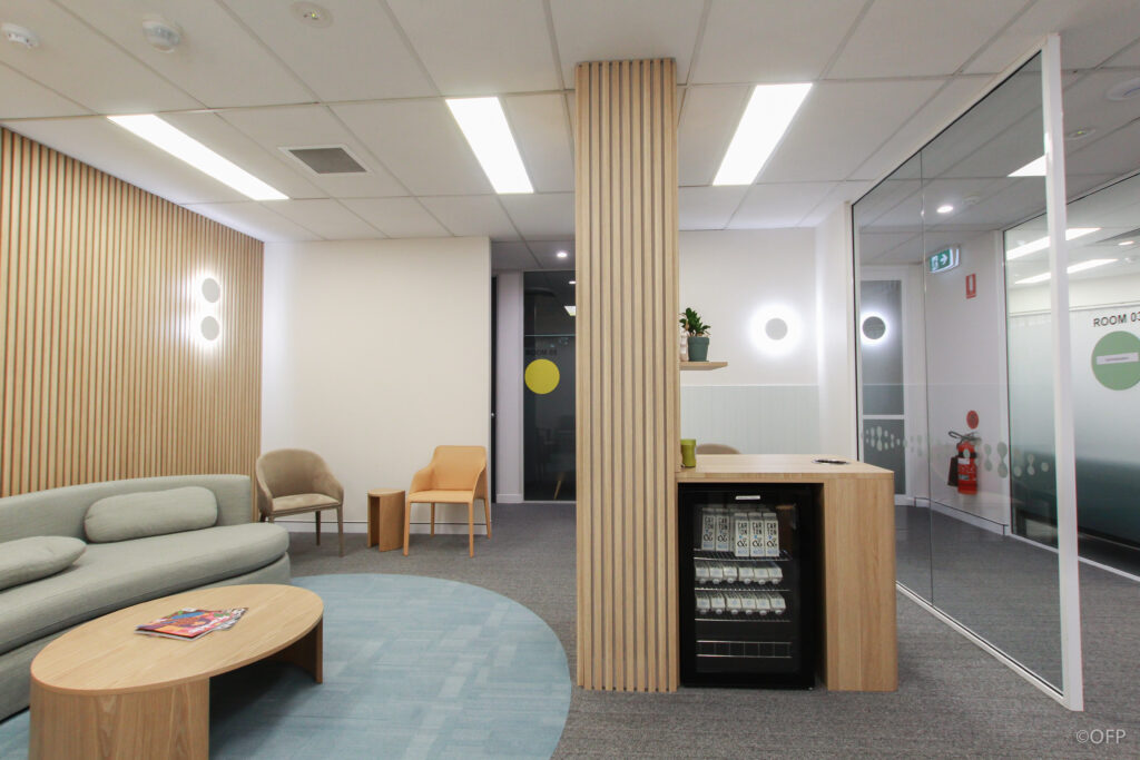 We custom-cut different carpets tiles into the existing flooring, created bespoke joinery and wall panelling and installed special feature lighting to create an exciting tenancy consistently involving company colours throughout. The result is an uplifting workplace and a welcoming environment for patients delivered with the full trust and collaboration with LDE.