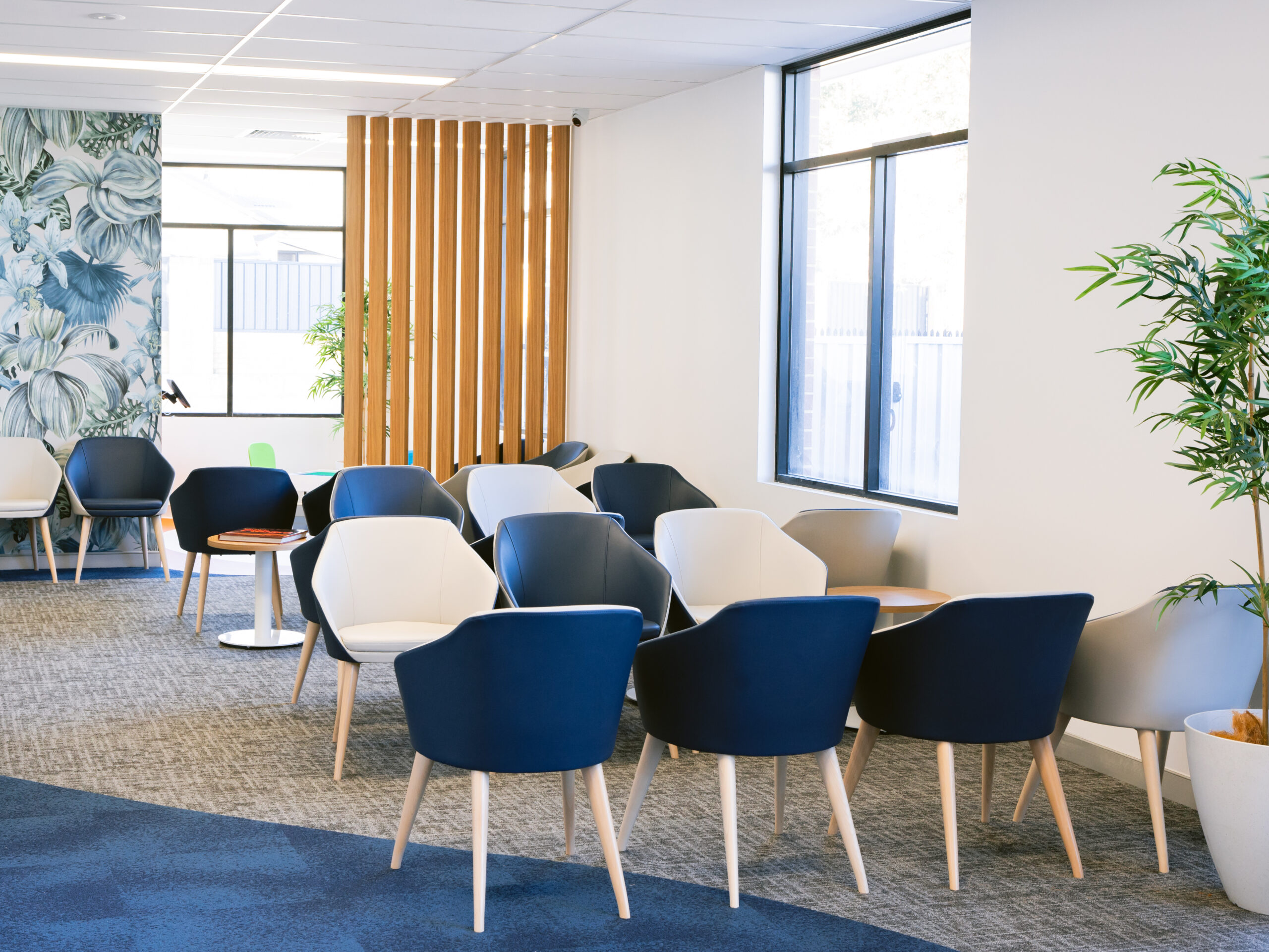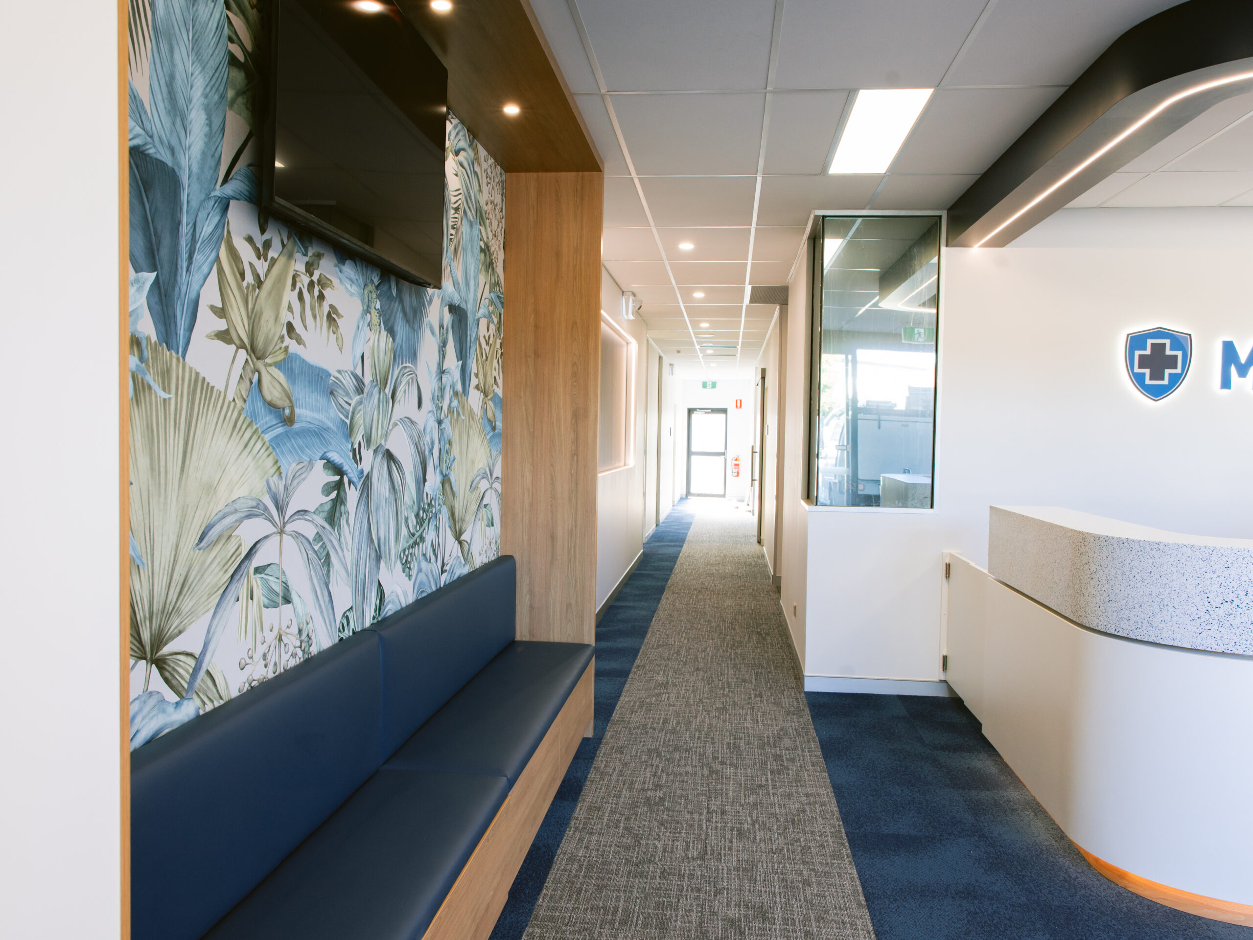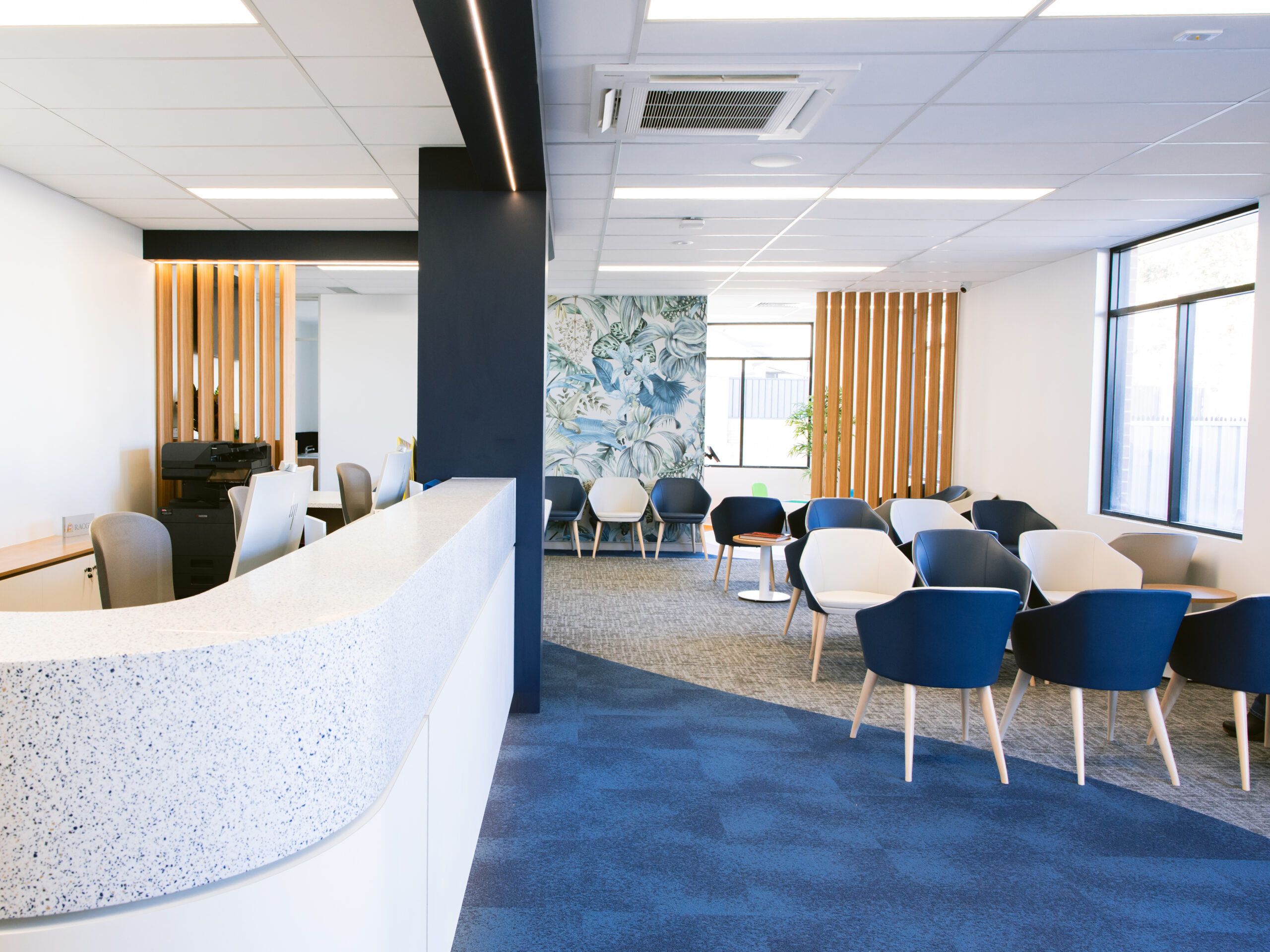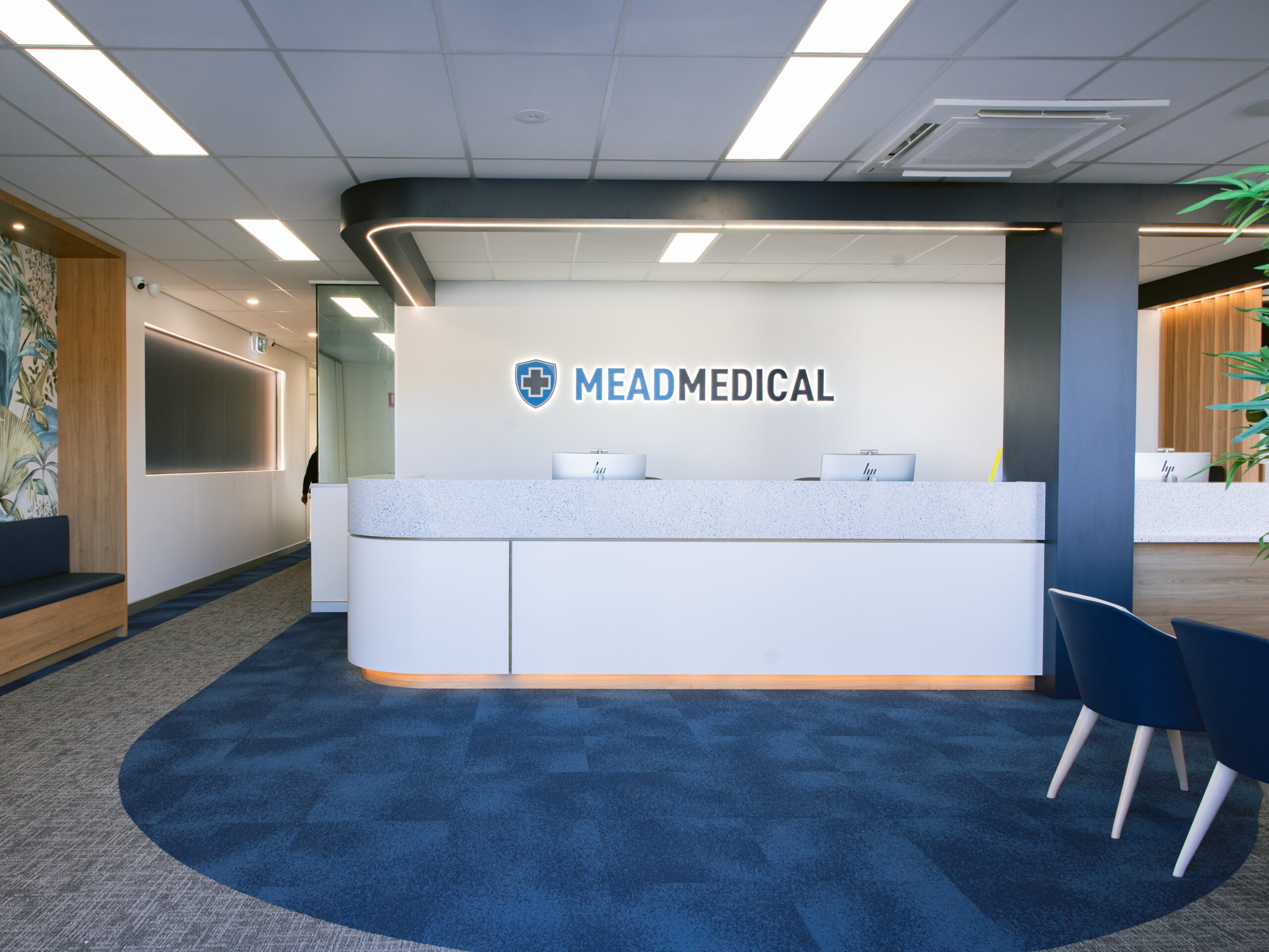 Mead Medical was a cold shell fit out with only base Build Toilets. Our team install new Hydraulics / Airconditioning / Electrics Power – Data – Lighting. New flooring was designed by our in-house design team with contrasting carpet colours, vinyl walls and flat lay vinyl flooring (coved to areas sterile nature)