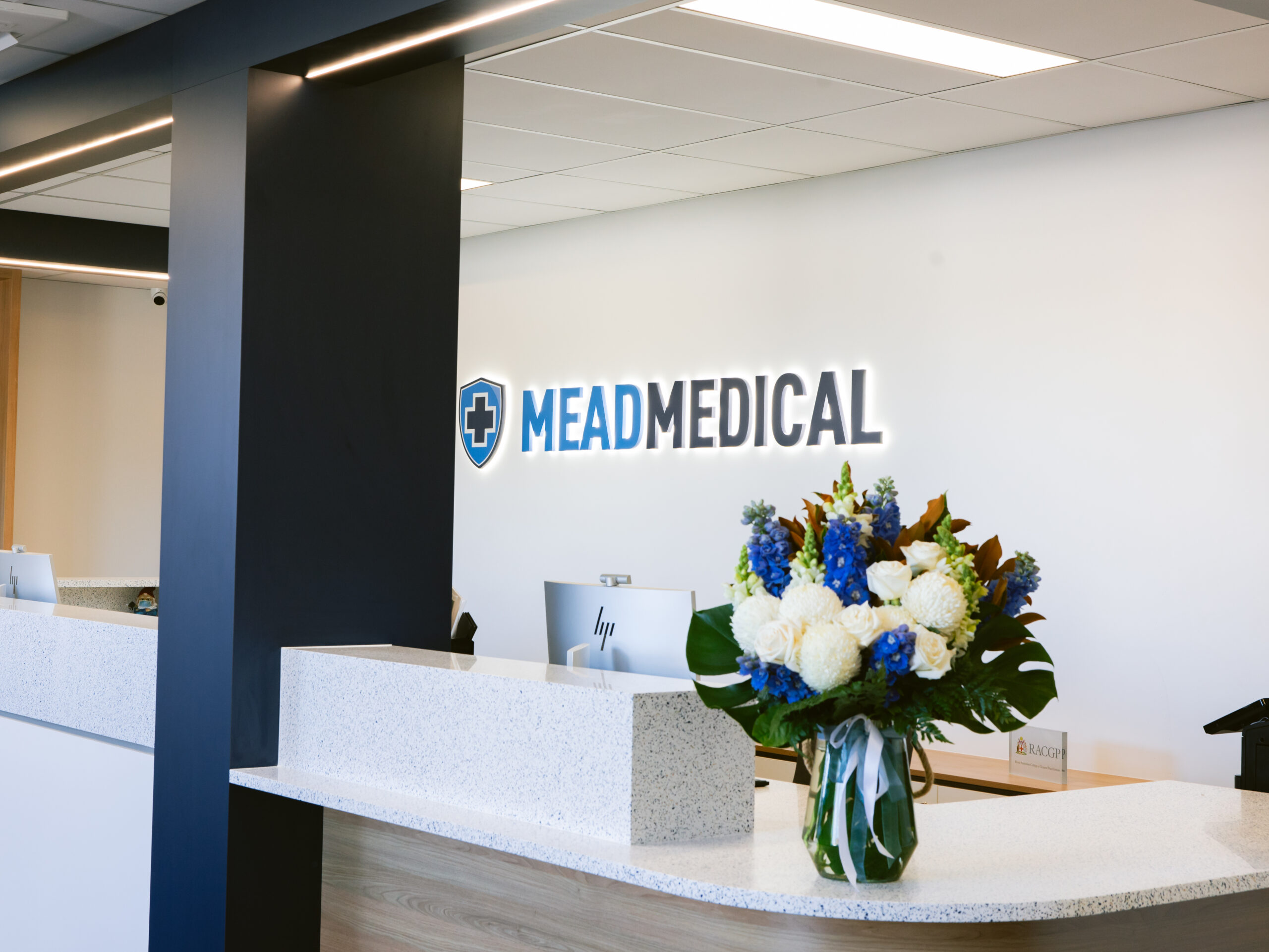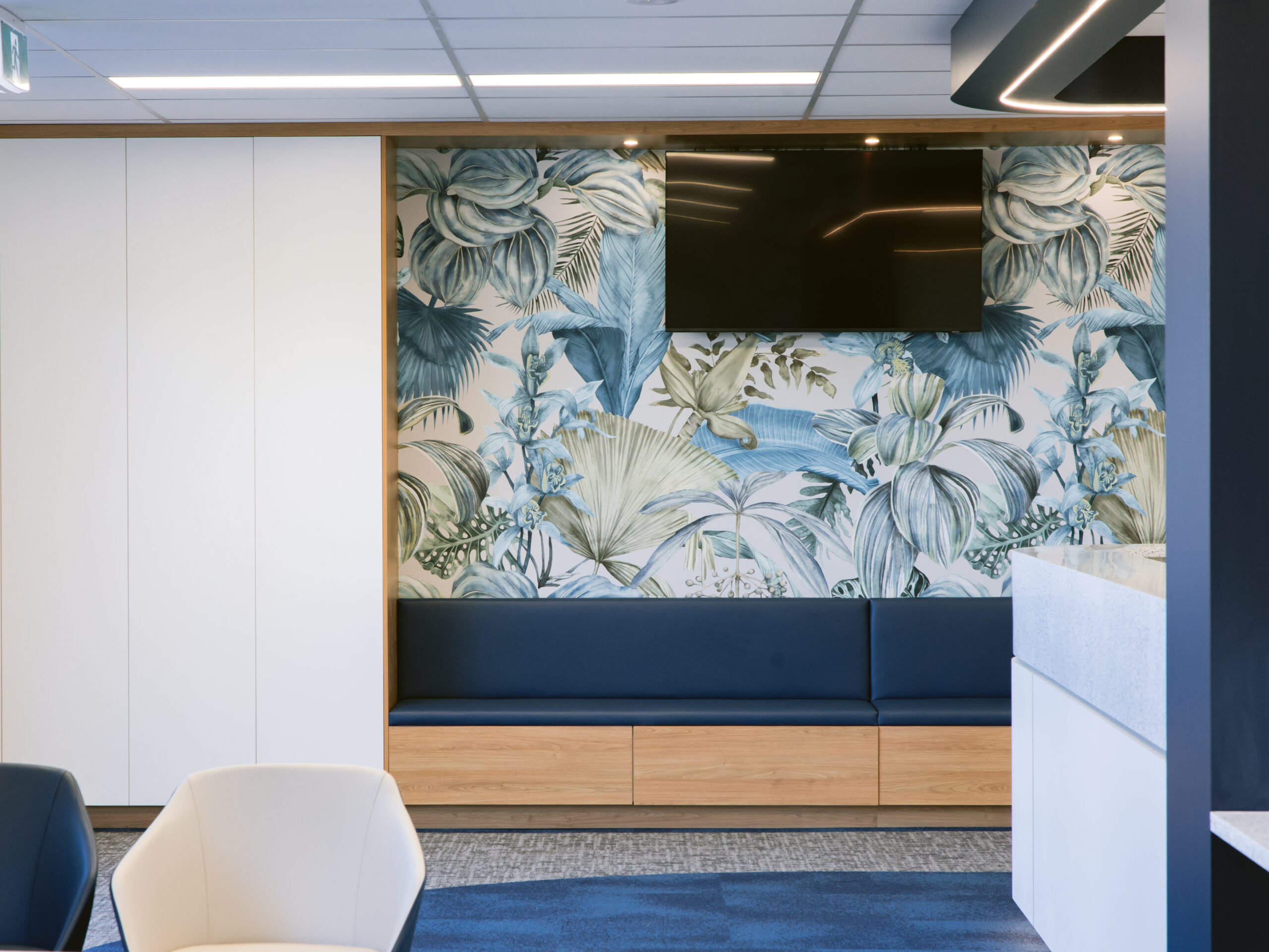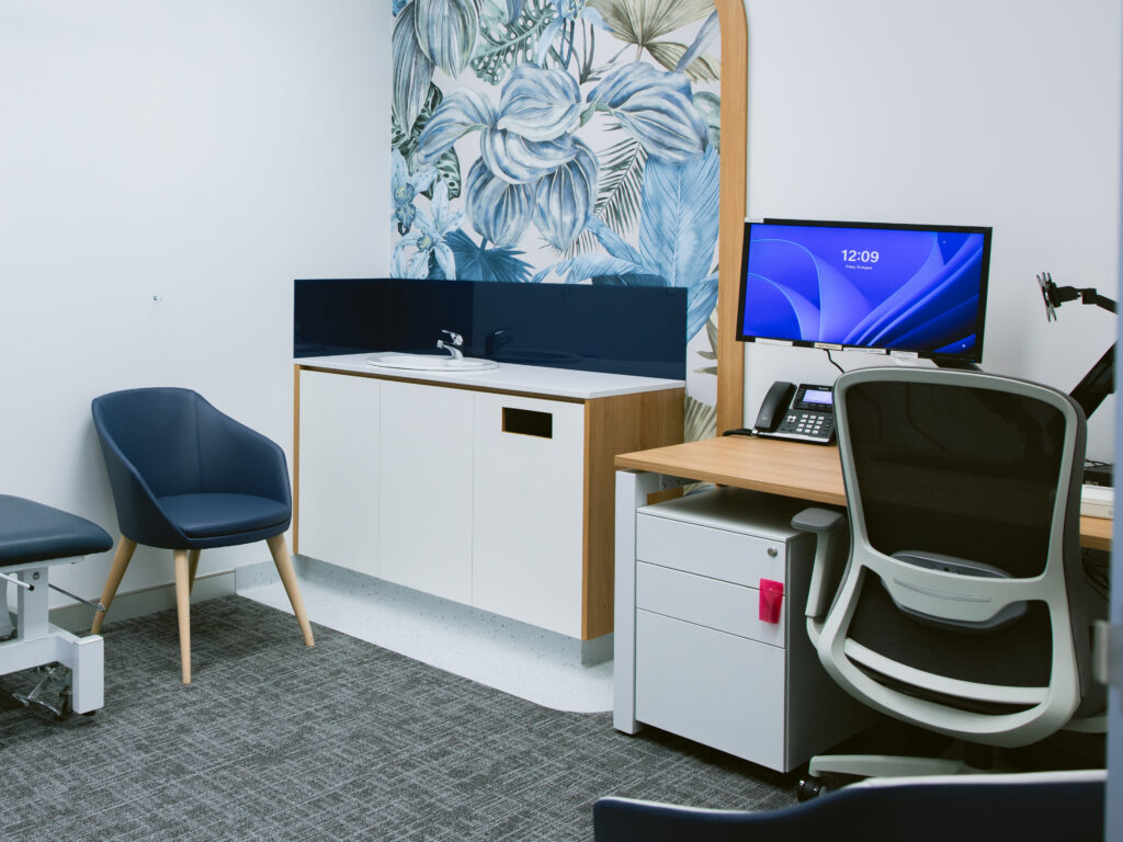 Mead Medical was a cold shell fit out with only base Build Toilets. Our team install new Hydraulics / Airconditioning / Electrics Power – Data – Lighting. New flooring was designed by our in-house design team with contrasting carpet colours, vinyl walls and flat lay vinyl flooring (coved to areas sterile nature)