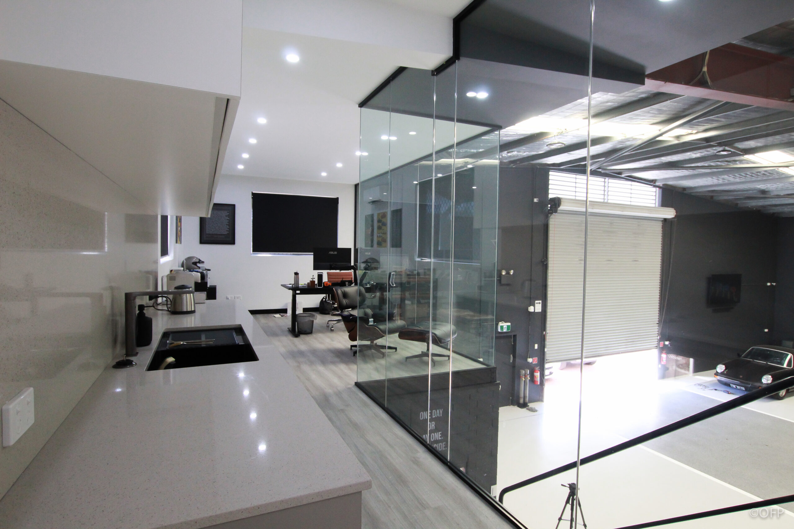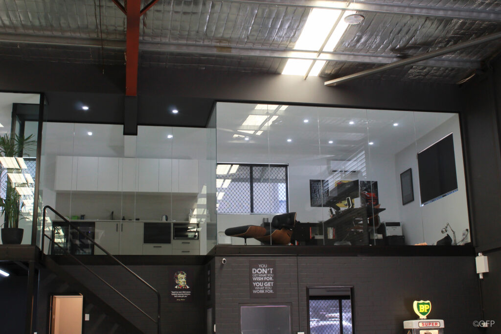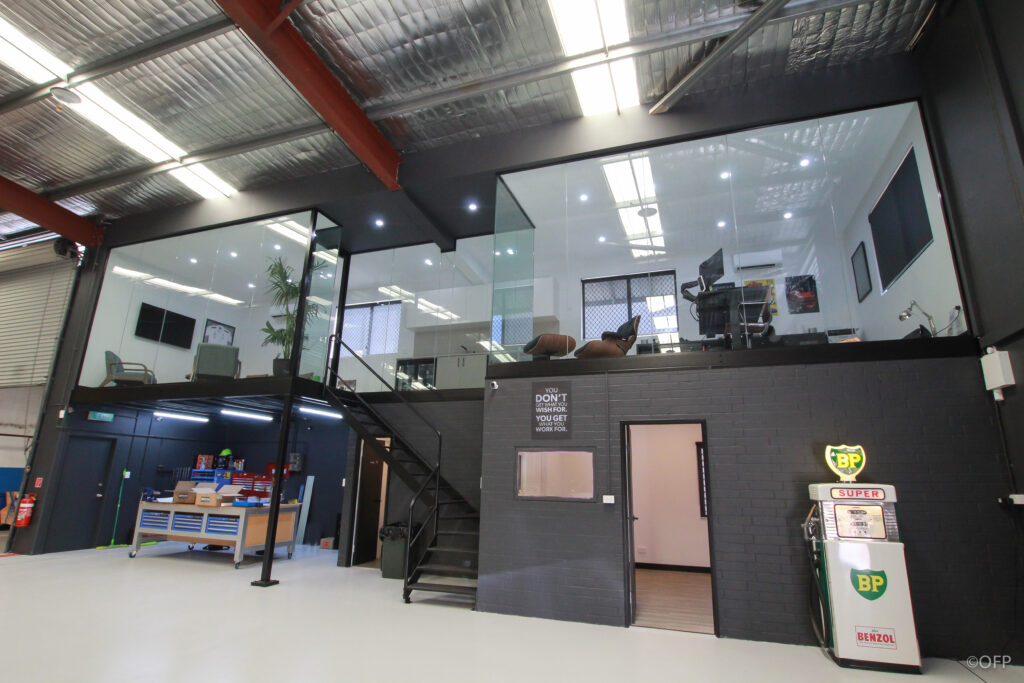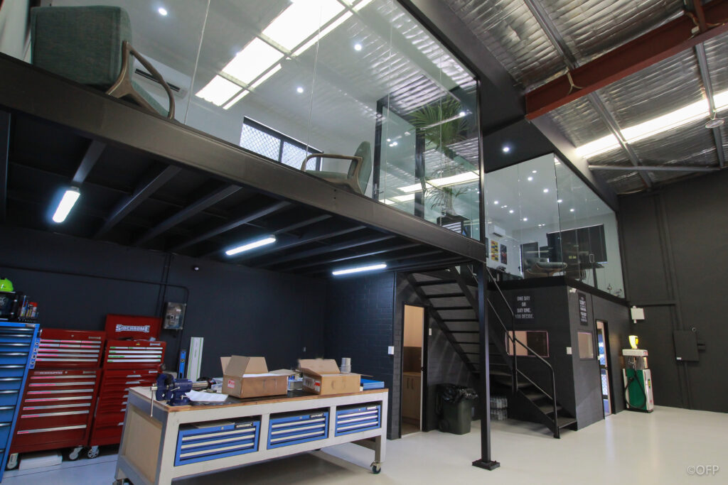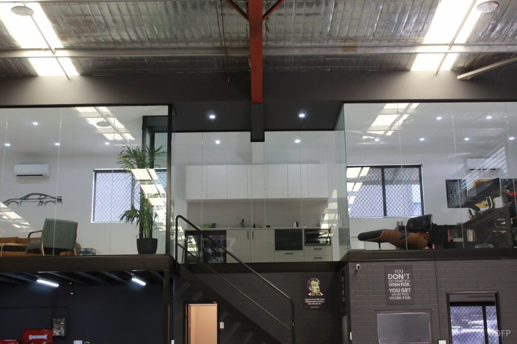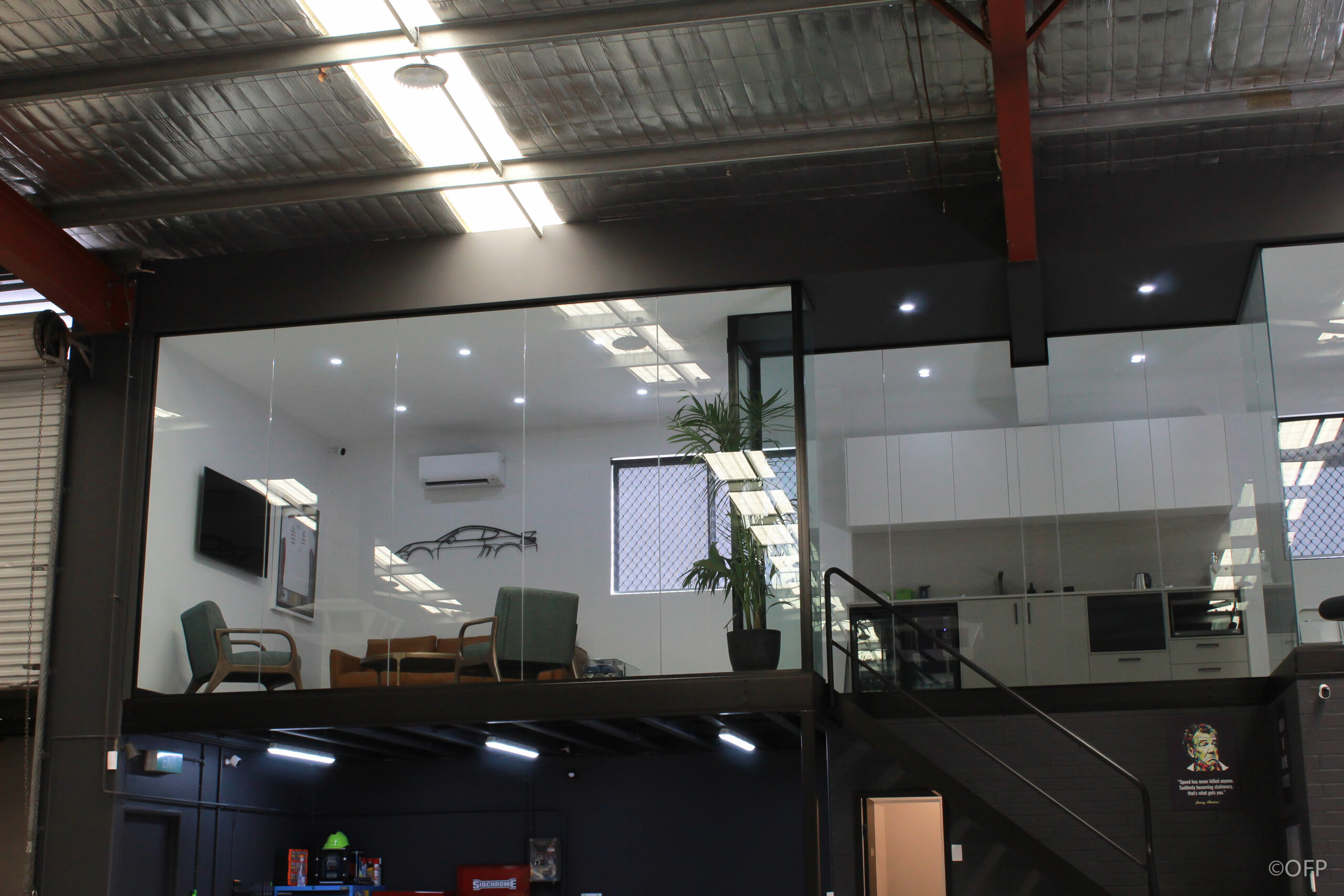 Creating a modernised office space including a kitchen onto an existing mezzanine with a full height glass floor to ceiling looking over his workshop.
