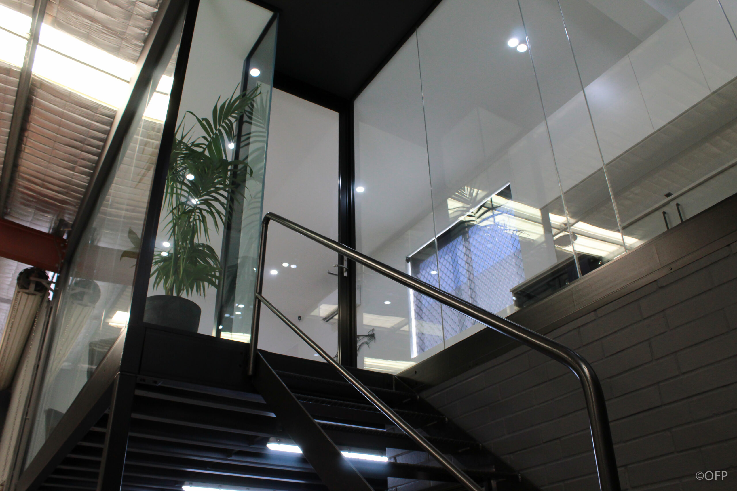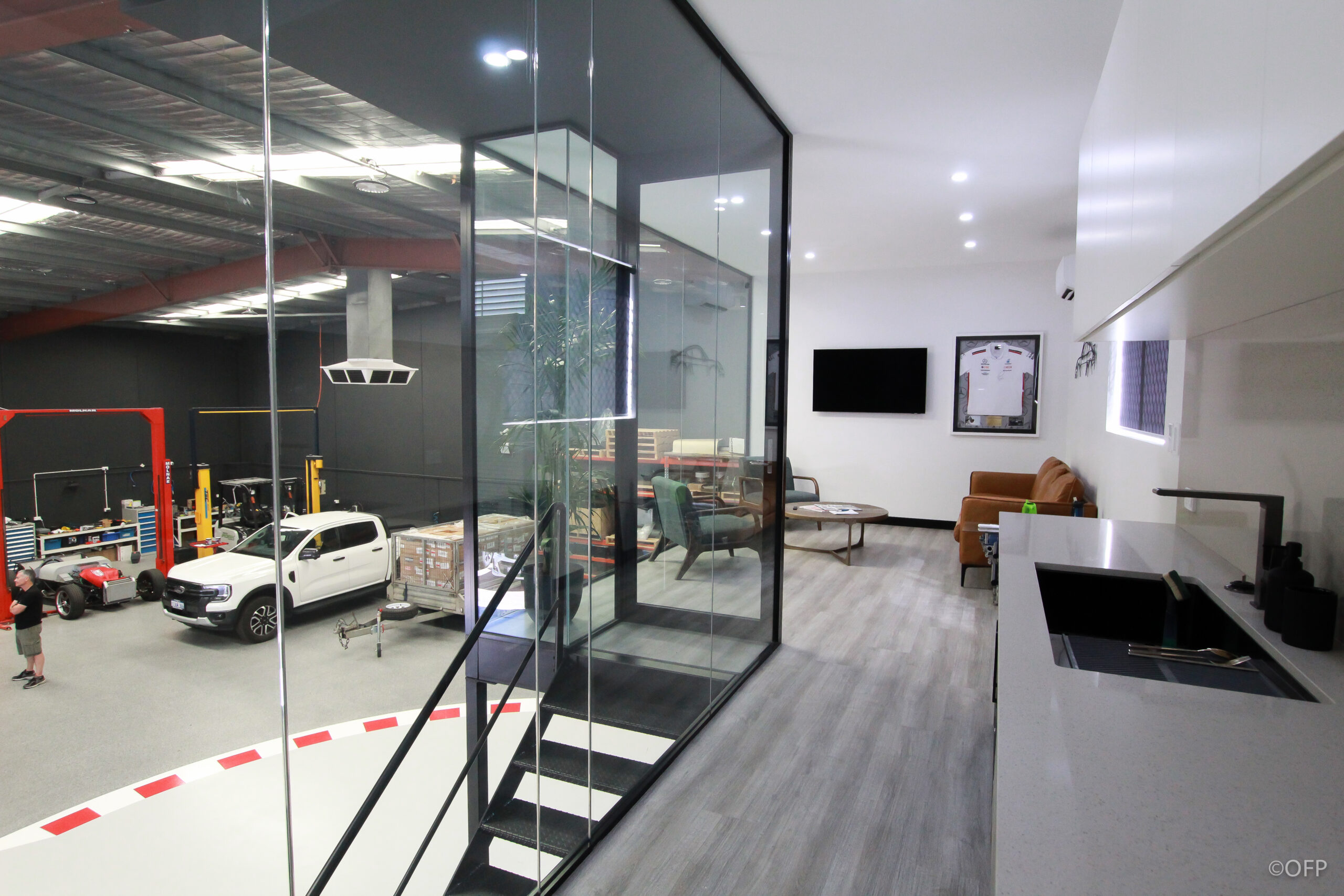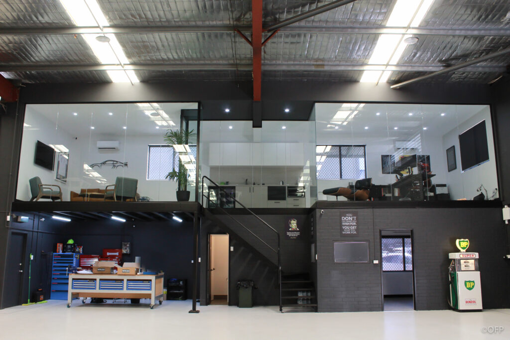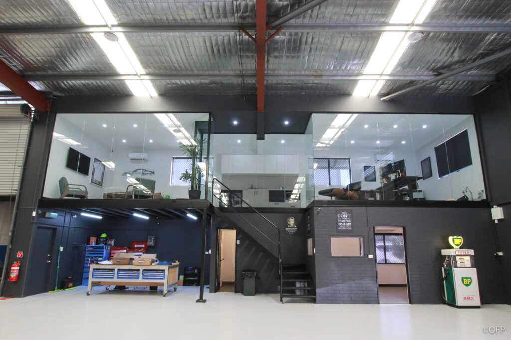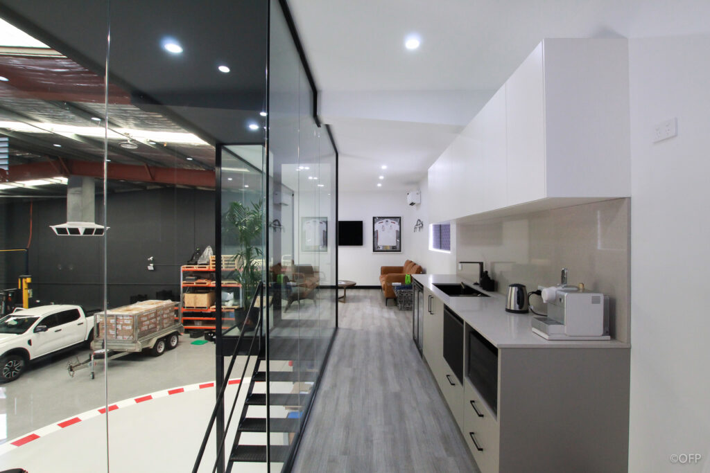 Creating a modernised office space including a kitchen onto an existing mezzanine with a full height glass floor to ceiling looking over his workshop.