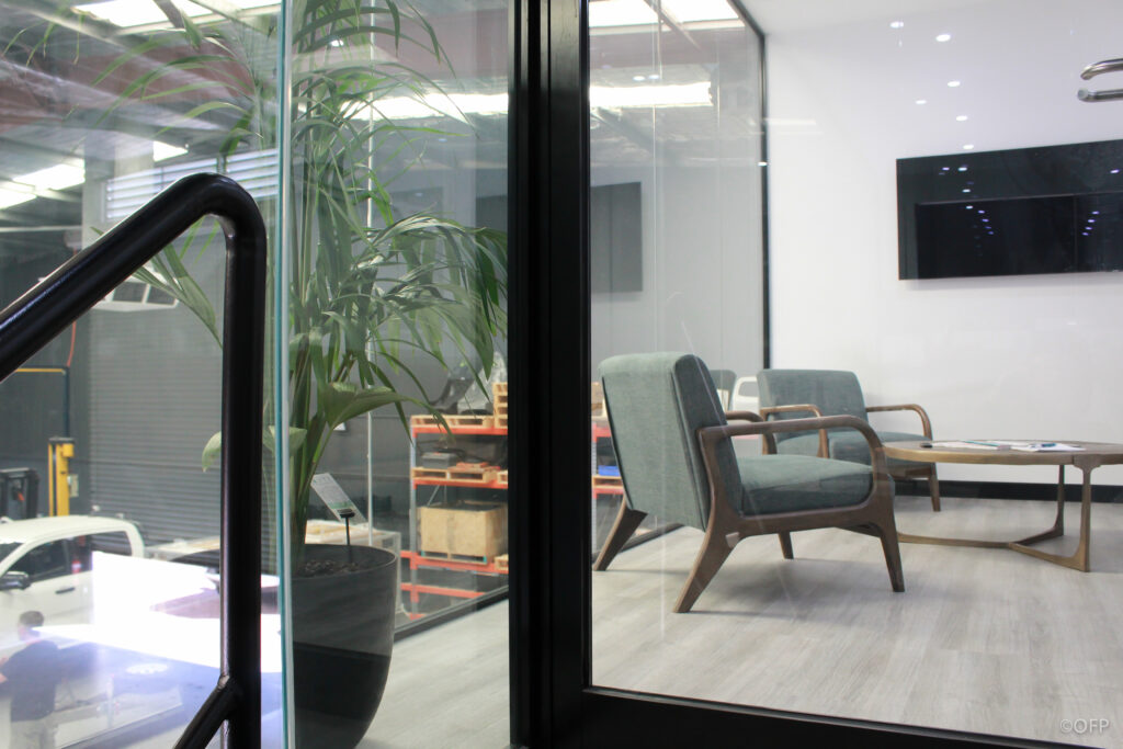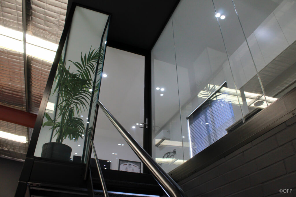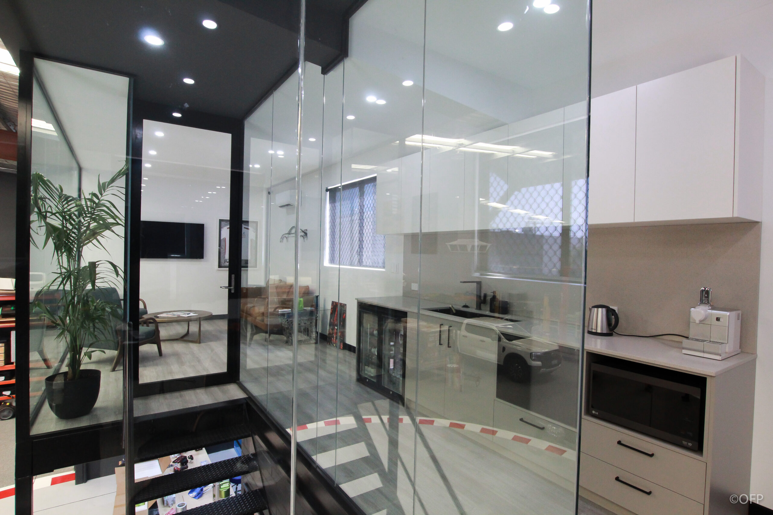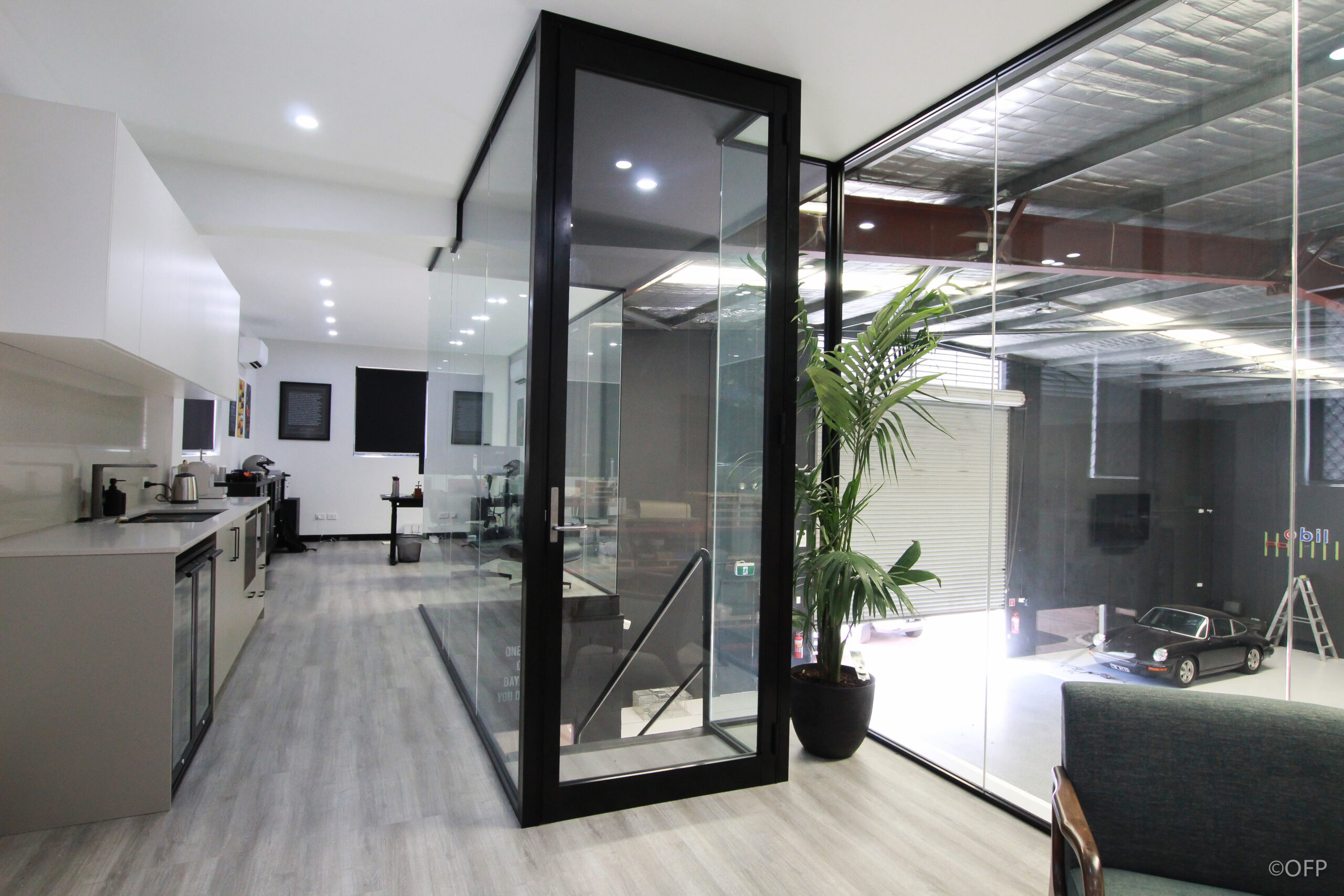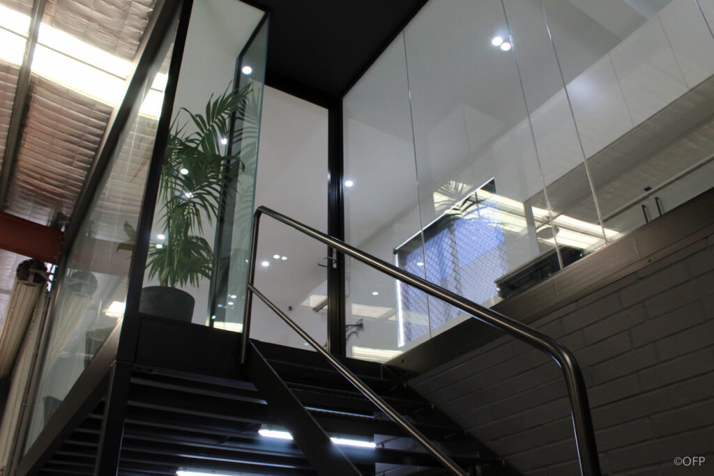 Creating a modernised office space including a kitchen onto an existing mezzanine with a full height glass floor to ceiling looking over his workshop.