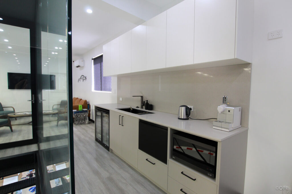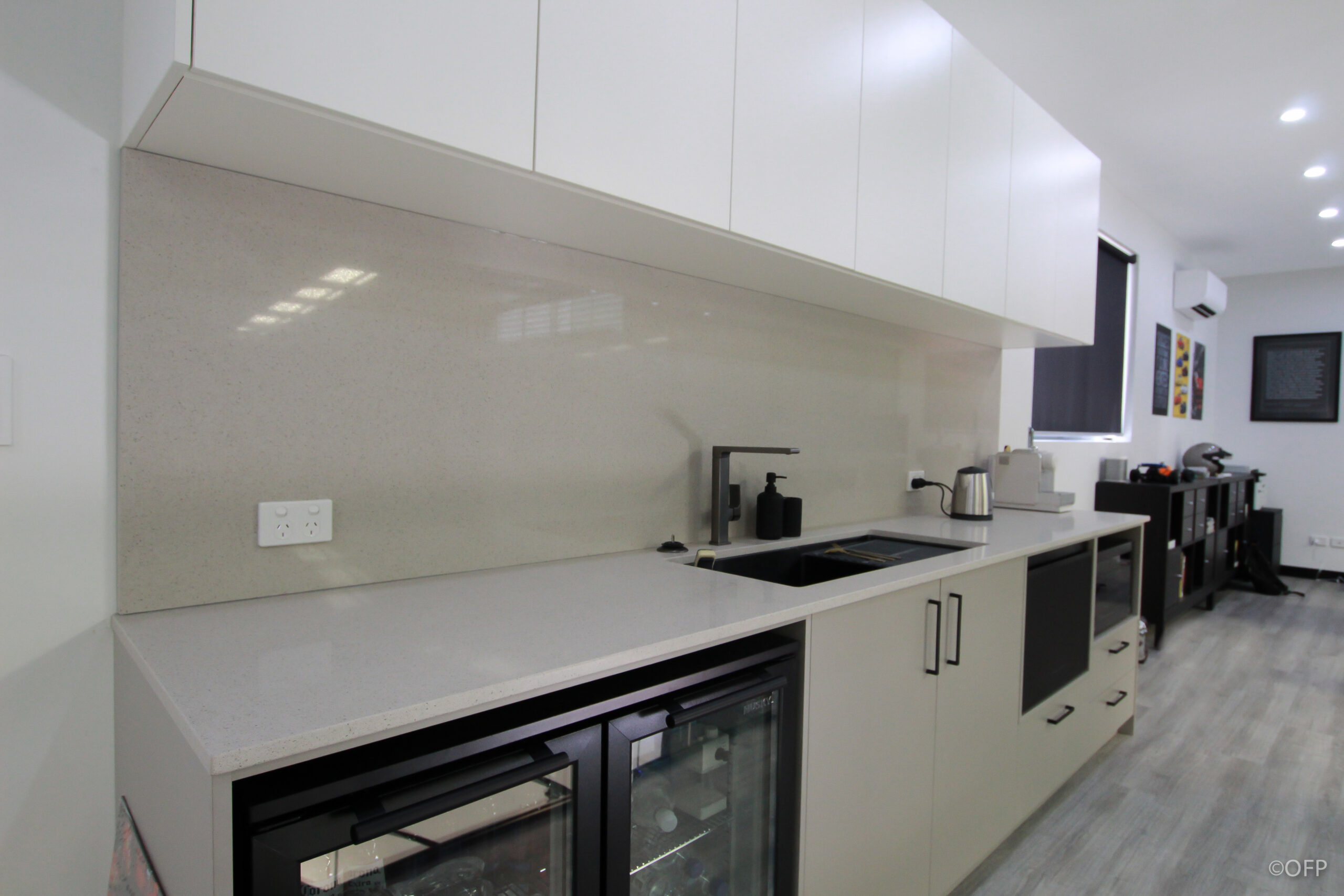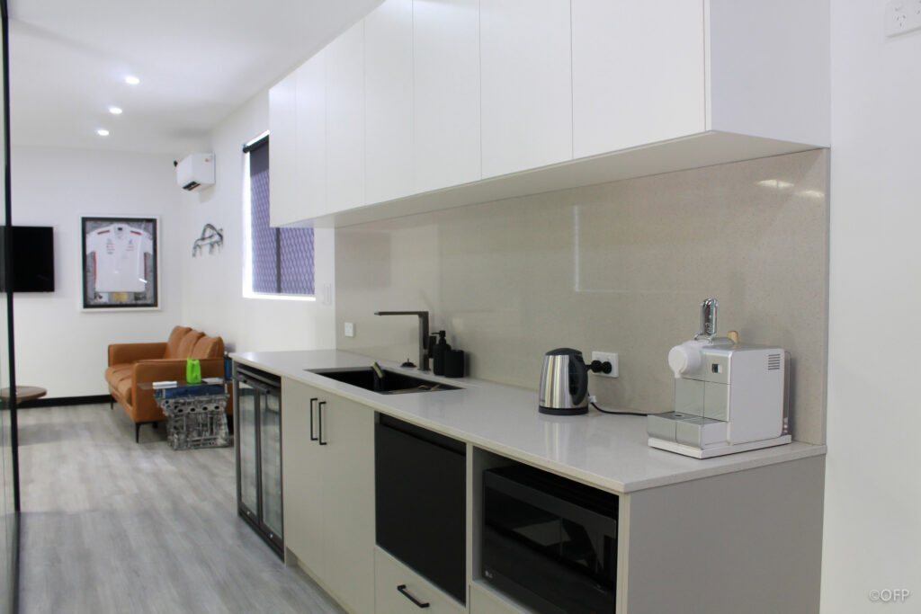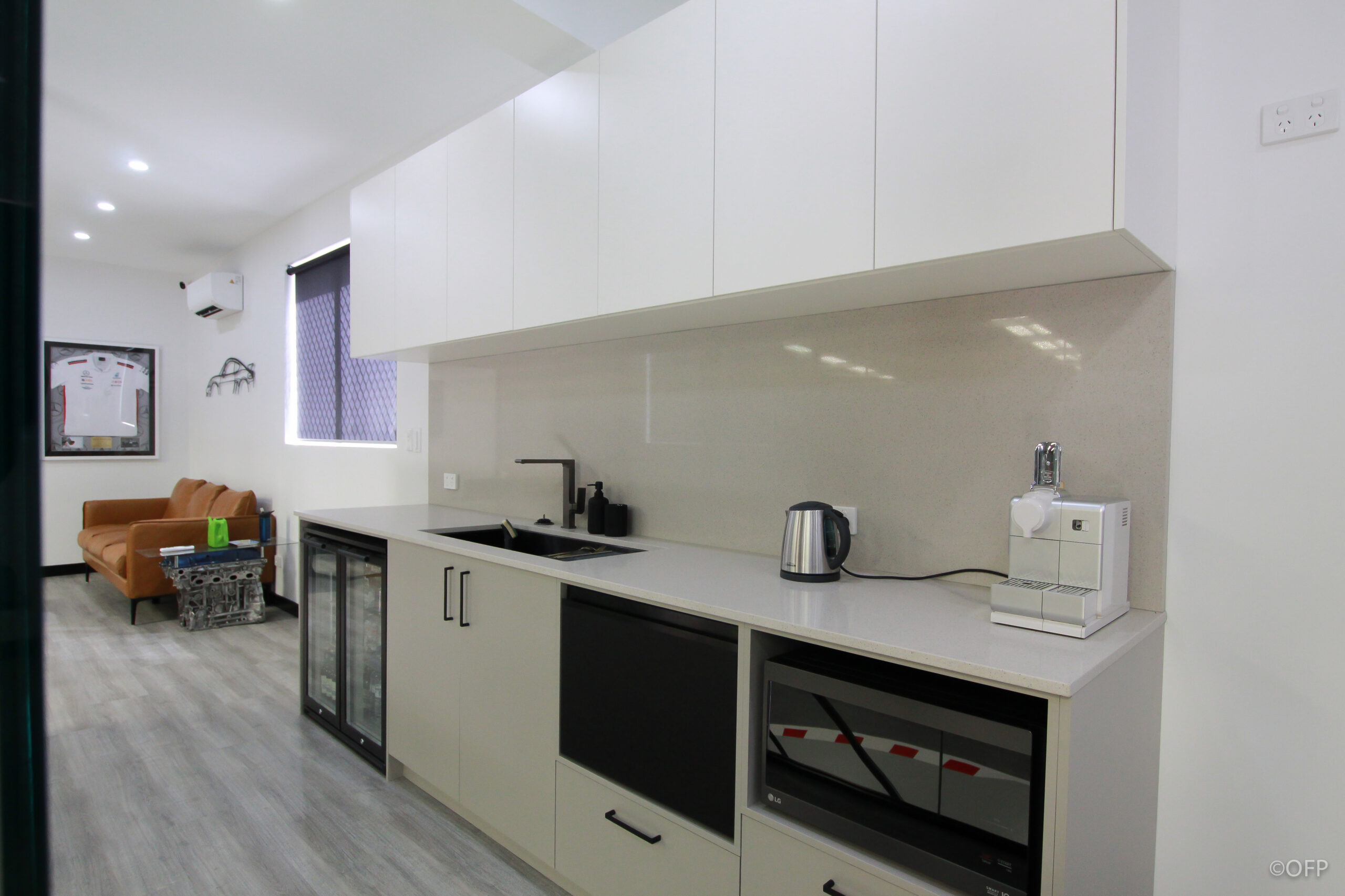 In Osborne Park we transformed a warehouse into a unique office and entertaining space for a client seeking a personal ‘mancave’. The mezzanine was lined with full-height glass allowing a clear view over the client’s collection of cars below while also housing a custom modern kitchen designed in house as well as an office and lounging space. Downstairs we renovated a new restroom and shower area to provide full amenities to the space. Although the end result brought excitement to the client, it brought plenty more excitement to the trades as they watched and helped this creative concept come to life.
