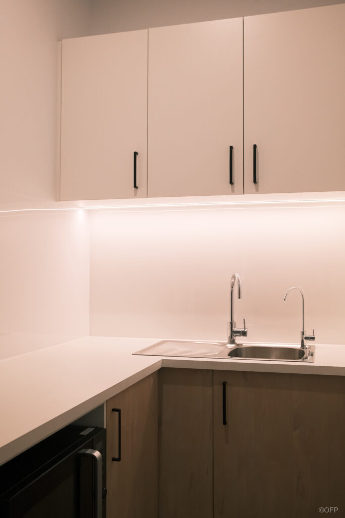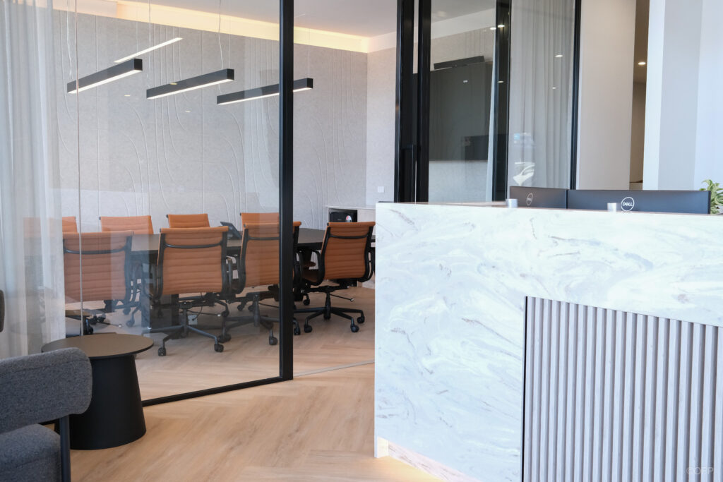 The client visited our design team to select finishes allowing us to seamlessly tie the furniture and joinery palette into the overall design. Our in-house designers produced custom concepts for the reception counter and kitchen which were then built and installed by our cabinetry team. The stone finish reception counter, bespoke credenzas and integrated storage pieces were created to enhance the space’s refined aesthetic and practical requirements.