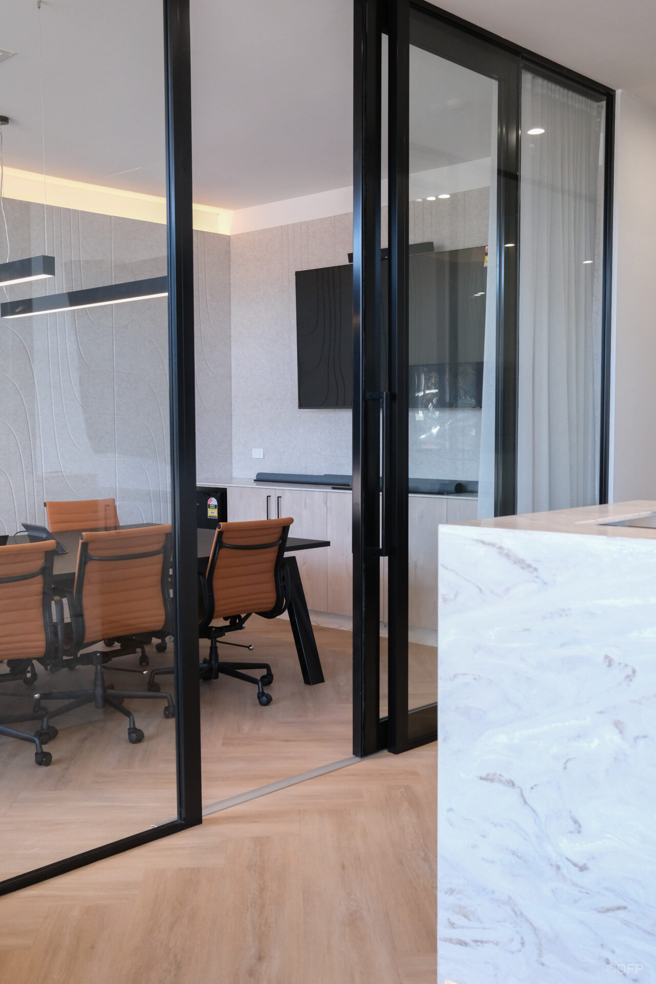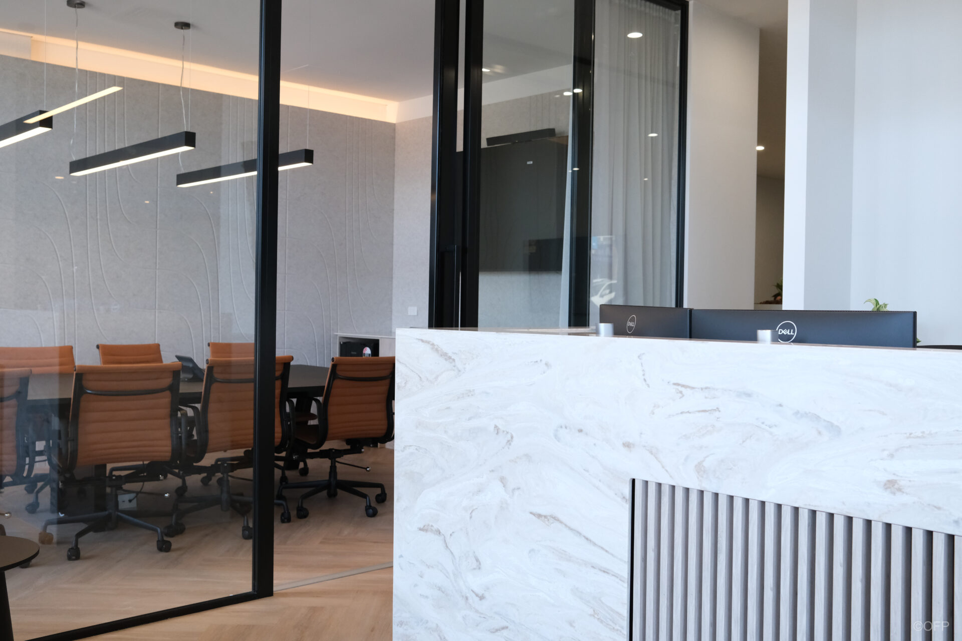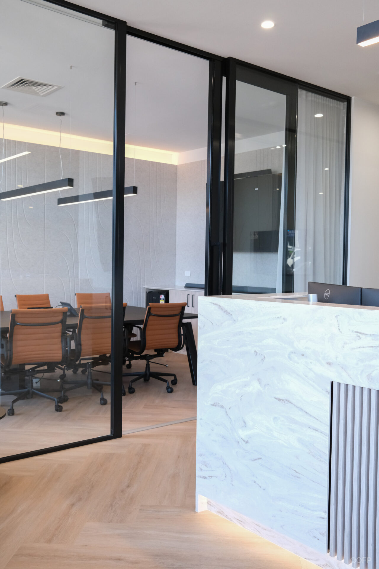 The final outcome was a sleek, luxurious office that exceeded the client’s expectations both in quality and turnaround time. OFP delivered the full space including everything seen in the attached images resulting in a cohesive, modern workplace. The combination of stone elements, bespoke joinery, acoustic panels and feature lighting created an elevated yet professional environment. OFP are extremely proud of this project and the complete transformation achieved.