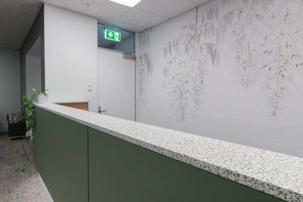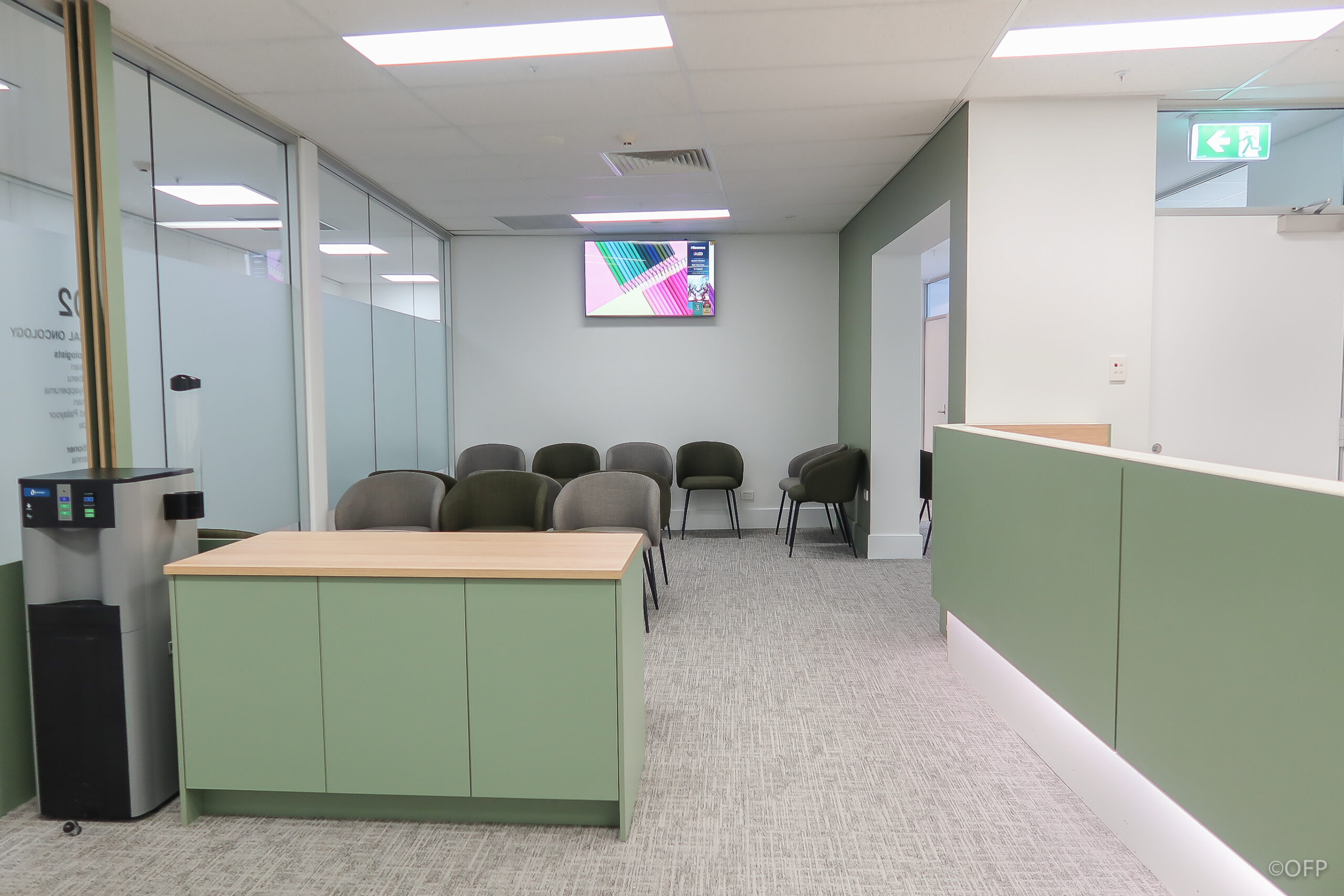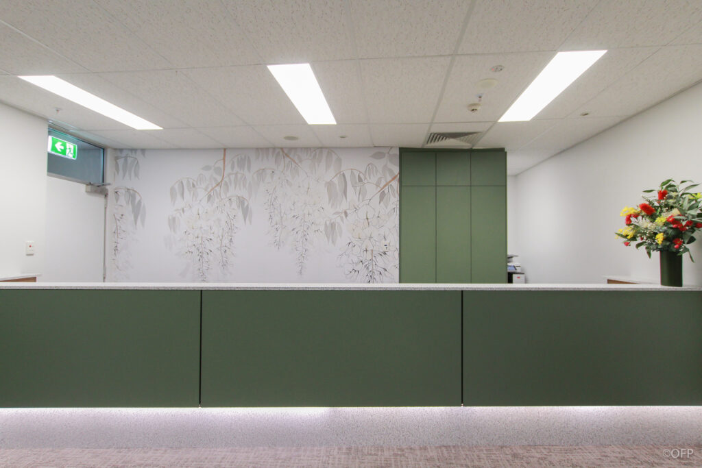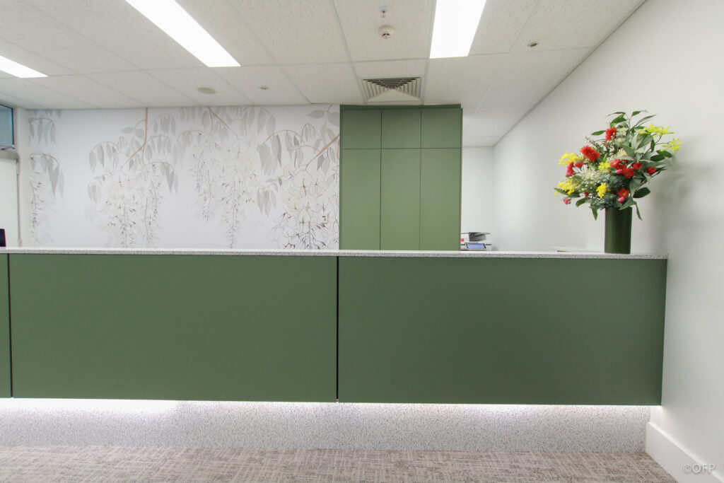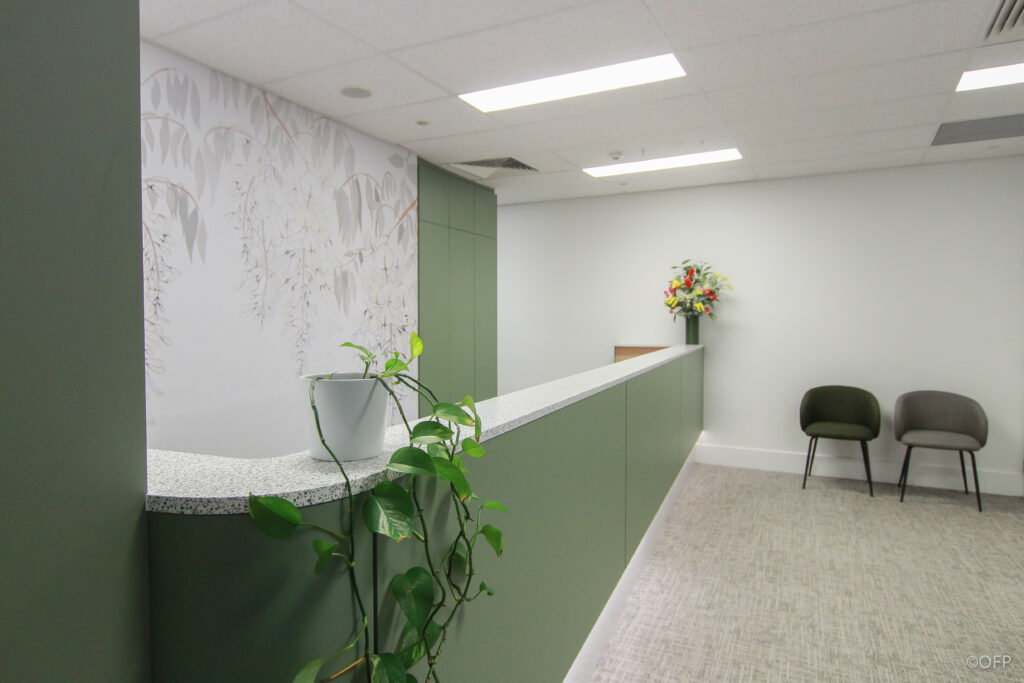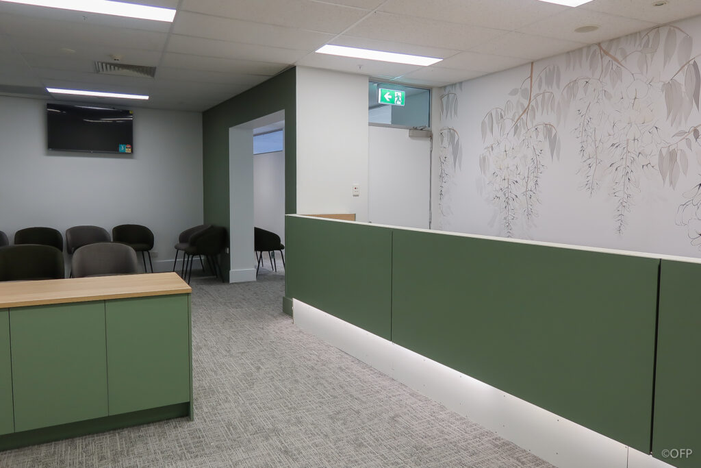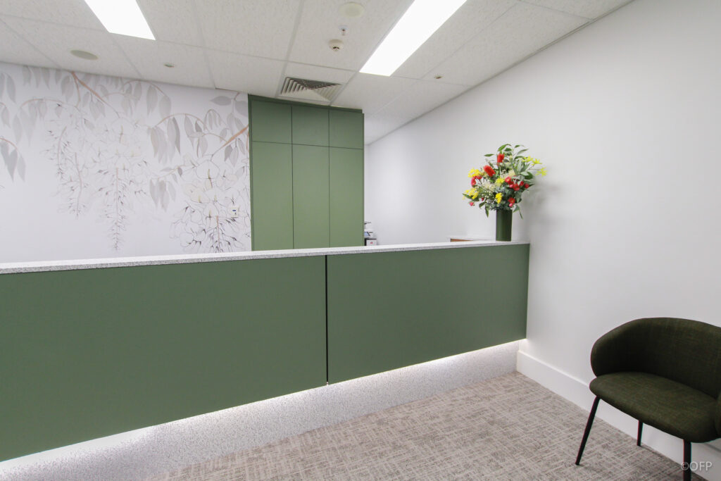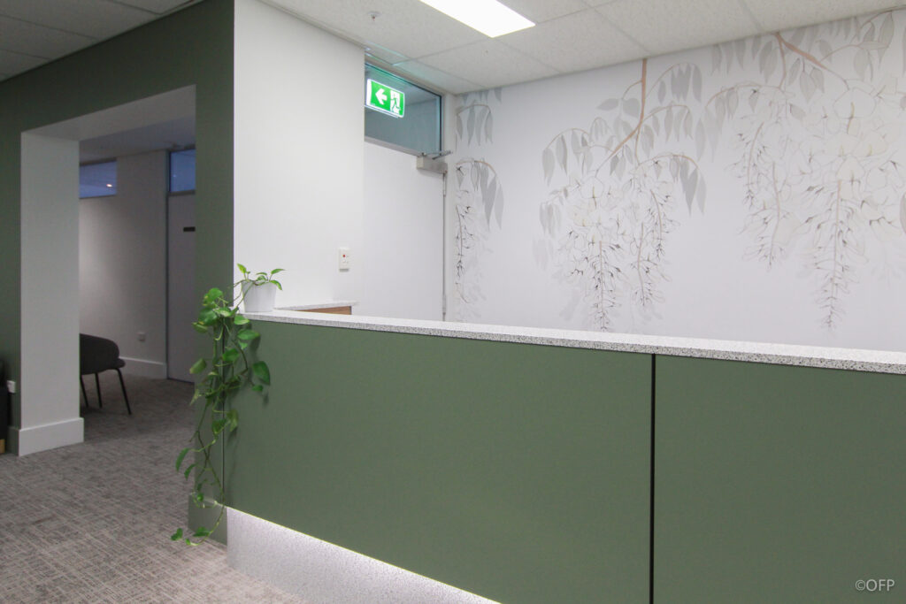 St John of God Hospital Subiaco are gradually upgrading suites across the hospital, giving OFP the opportunity to bring fresh design concepts tailored to each tenant’s needs and preferences. Suite C202 reflects a carefully considered design by our Senior Designer Angela who was informed in the initial briefing that patients visiting this suite often feel anxious and unsettled. Iin order to put patient experience first, Angela introduced a calming green accent throughout the space specifically to detail the psychology of colour. Being associated with nature, green is known to evoke feelings of calm and balance making it a perfect choice for a medical waiting room and reception. Custom joinery, bespoke wallpaper, furniture and carpet were combined to create a welcoming atmosphere that aimed to reduce stress and increase relaxation for both patients and staff. The result is a modern, soothing space that has been warmly received by the doctors, their team and returning patients.