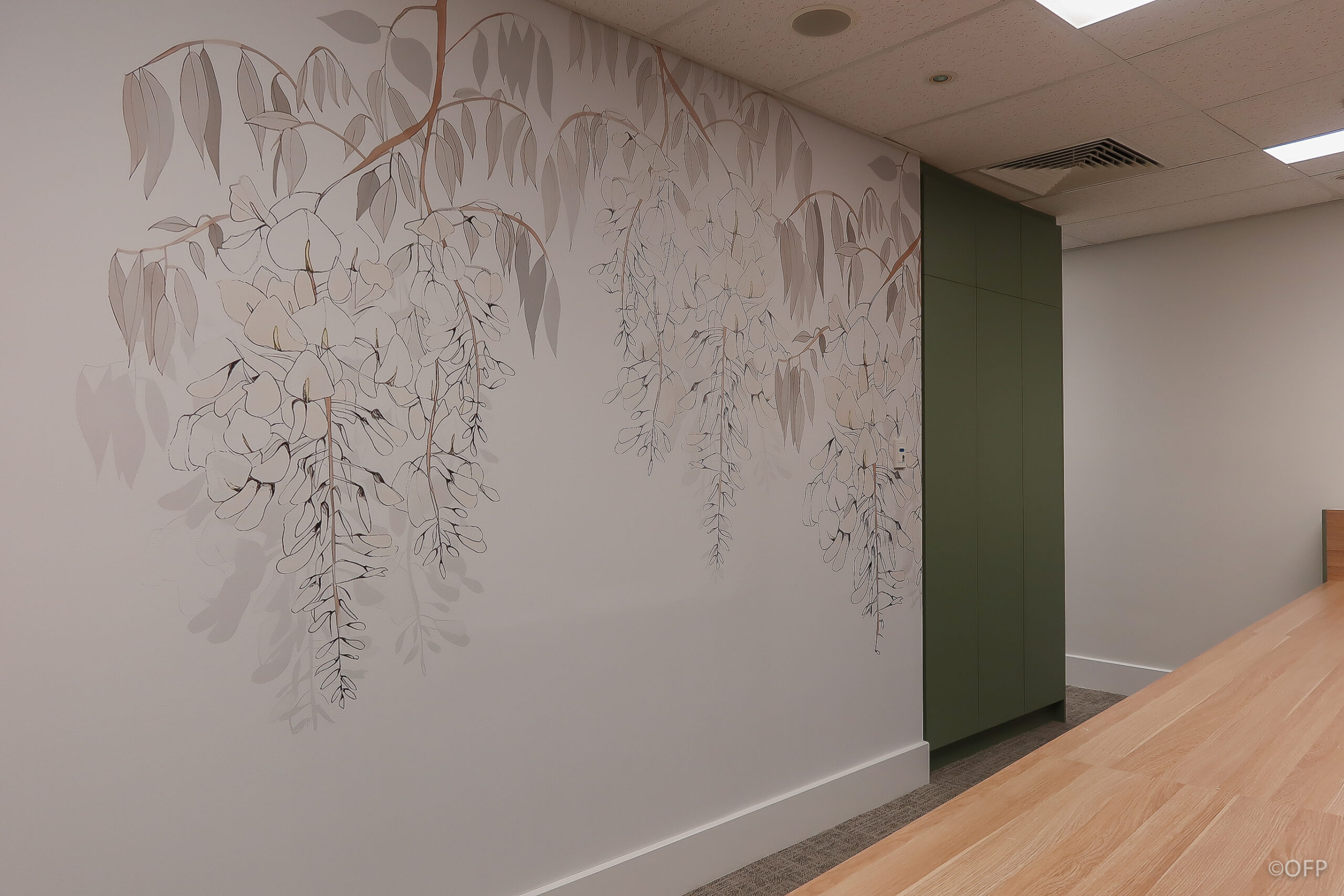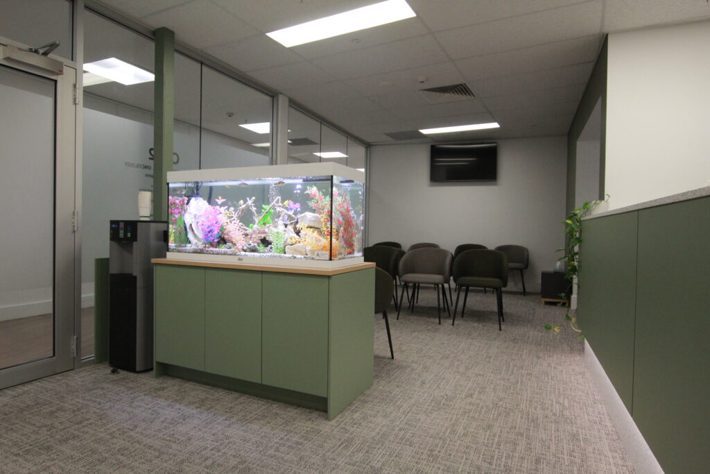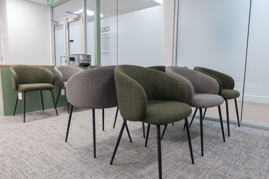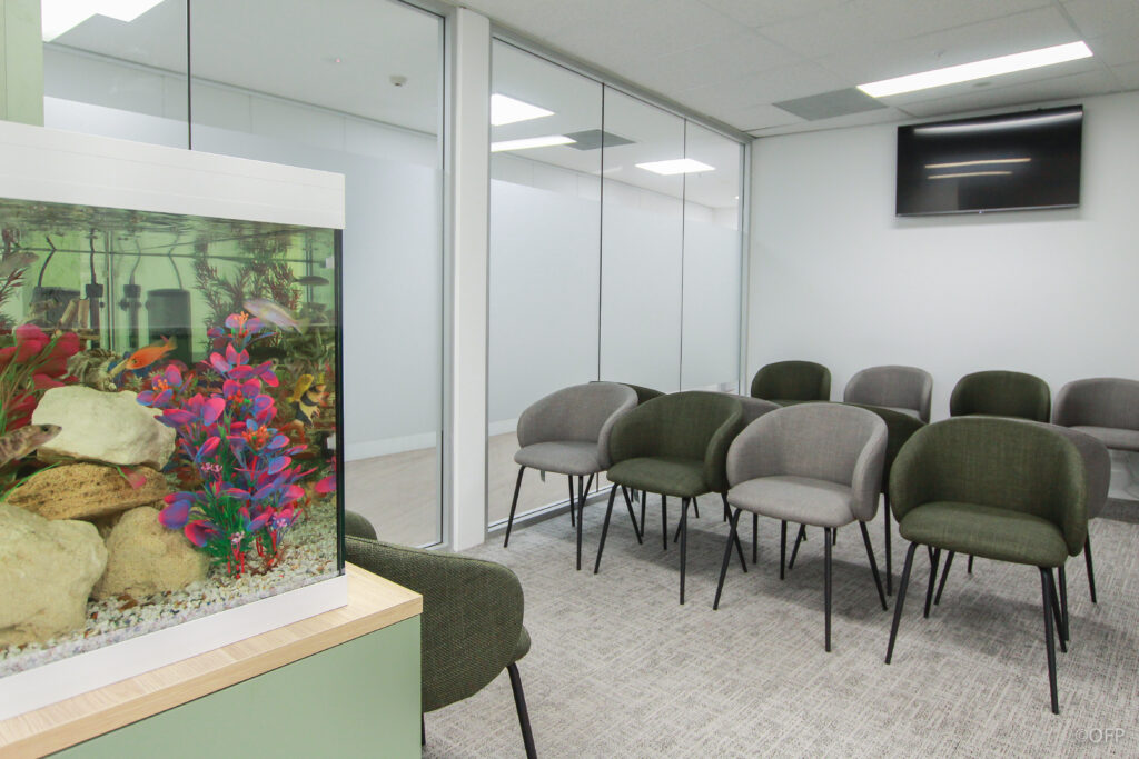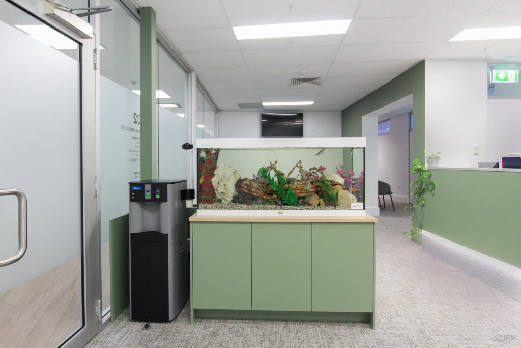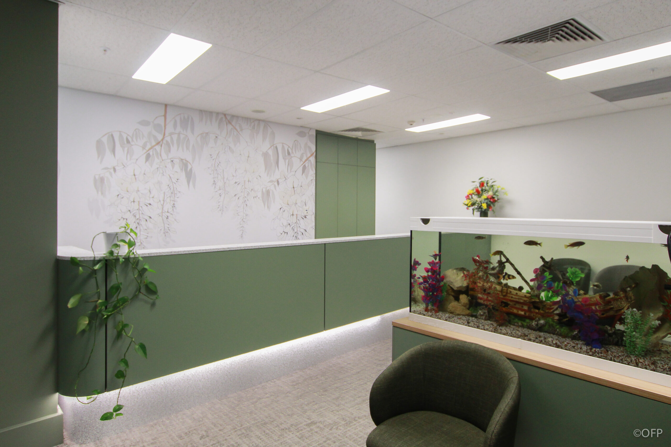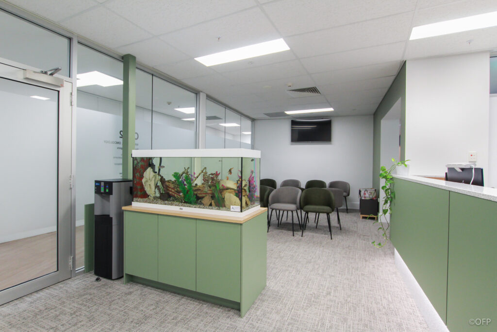 St John of God Hospital Subiaco are gradually upgrading suites across the hospital, giving OFP the opportunity to bring fresh design concepts tailored to each tenant’s needs and preferences. Suite C202 reflects a carefully considered design by our Senior Designer Angela who was informed in the initial briefing that patients visiting this suite often feel anxious and unsettled. Iin order to put patient experience first, Angela introduced a calming green accent throughout the space specifically to detail the psychology of colour. Being associated with nature, green is known to evoke feelings of calm and balance making it a perfect choice for a medical waiting room and reception. Custom joinery, bespoke wallpaper, furniture and carpet were combined to create a welcoming atmosphere that aimed to reduce stress and increase relaxation for both patients and staff. The result is a modern, soothing space that has been warmly received by the doctors, their team and returning patients.